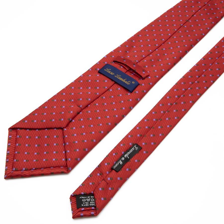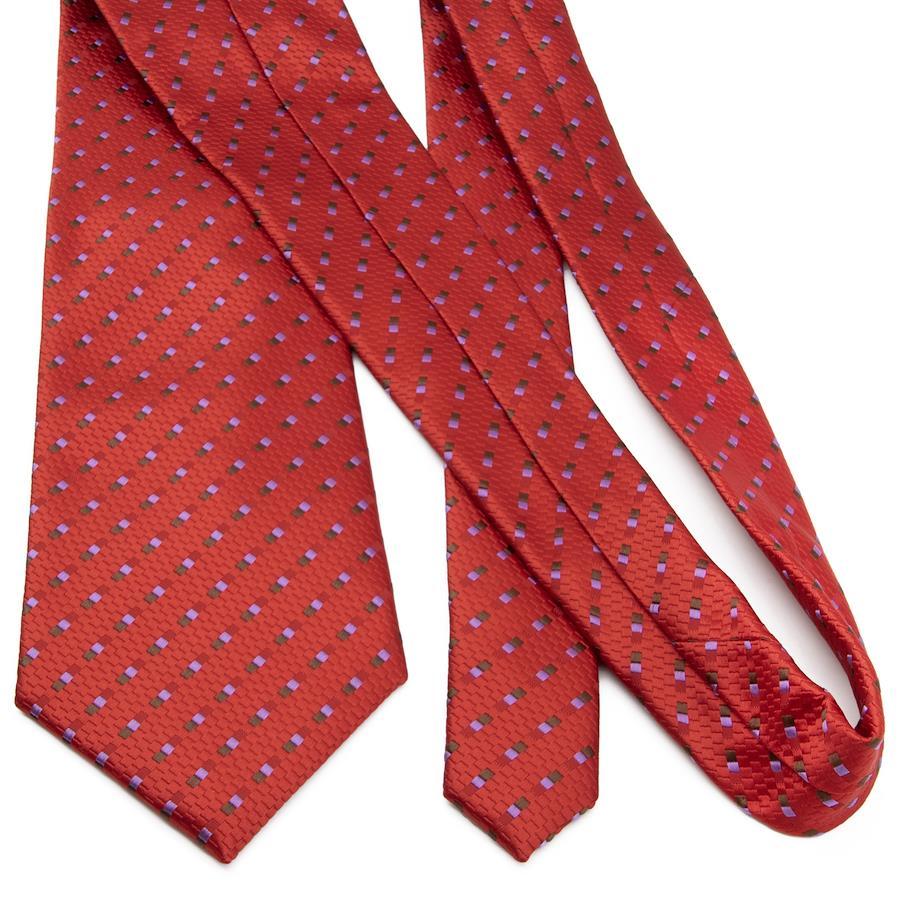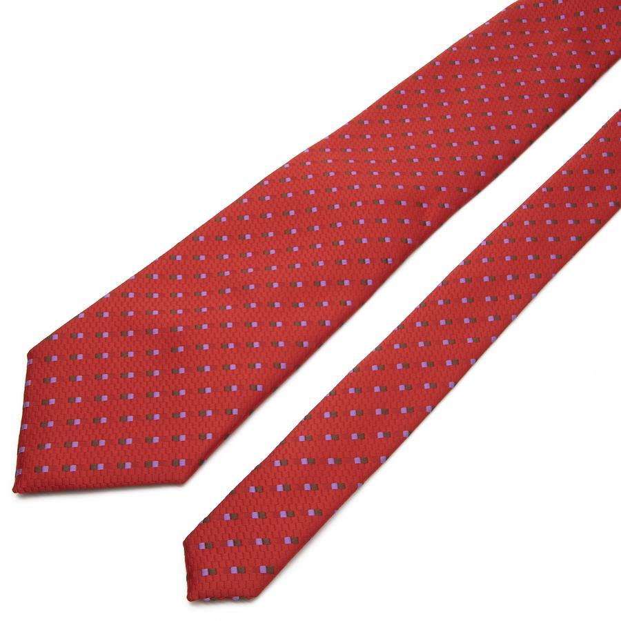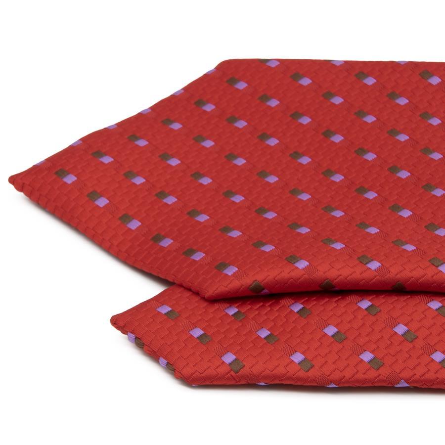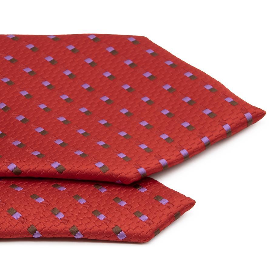 鮮烈なレッドを基調に、高貴なパープルと落ち着いたブラウンの小さなスクエアタイルを並べた、大変パワフルな一本。