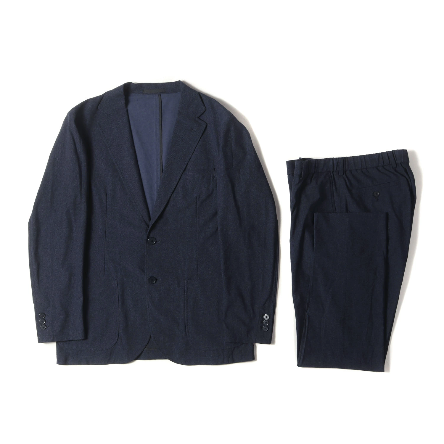 | 商品説明 | ヘリンボーン柄プリントが施された伸縮性のある薄手のストレッチポリエステル素材"FLEX DRY"生地を使用し、ジャケットはフロント2つボタン、裏地なし、袖口本切羽3つボタン、フロントダーツ、センターベント仕様、パンツはスリムストレートシルエットで仕上げられたセットアップスーツです。 |