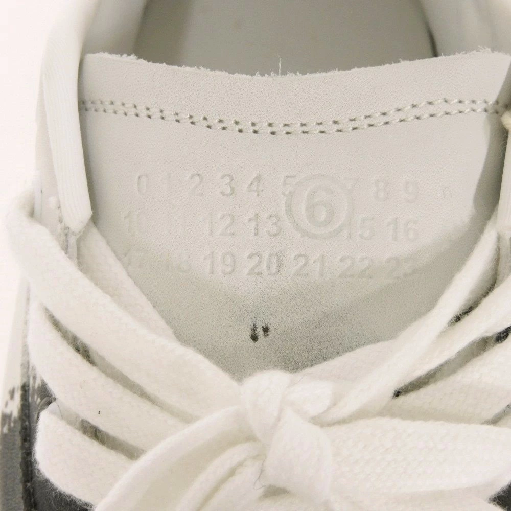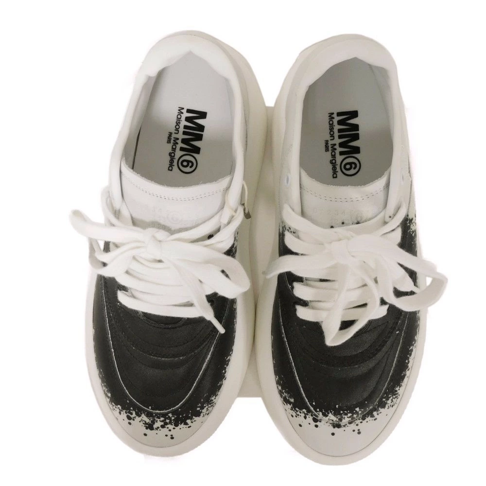 ペイントモチーフが施された、カーフレザーにメゾンマルジェラのMM6のシグネチャーロゴがエンボス加工された「ローカット ハーフペイント」プラットフォームスニーカーです。 |