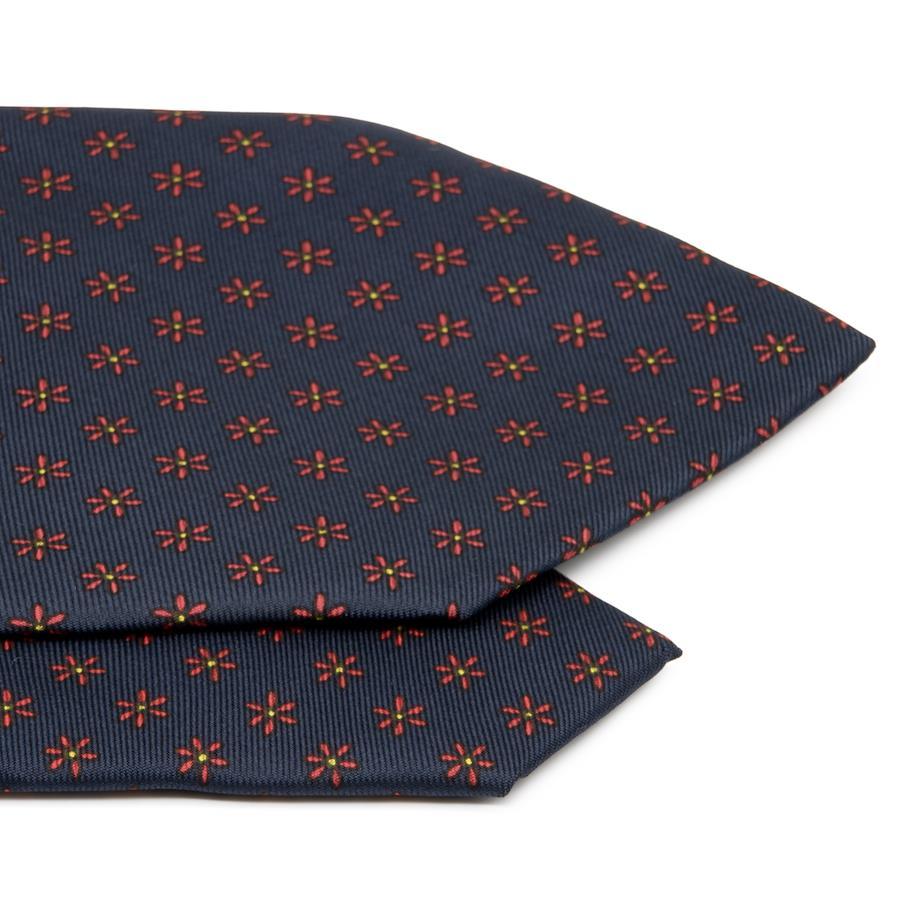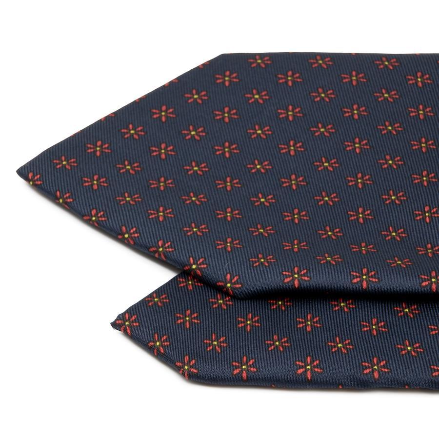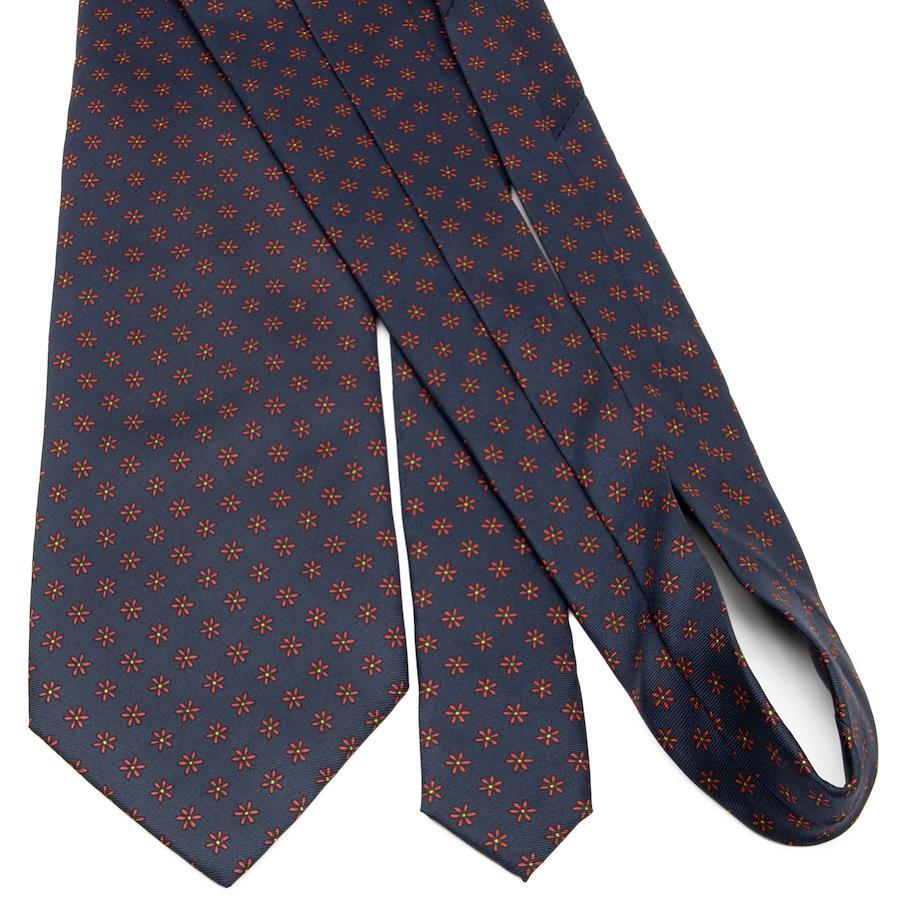 深いネイビーの地に、赤と黄色の小花柄が配された王道のデザインです。