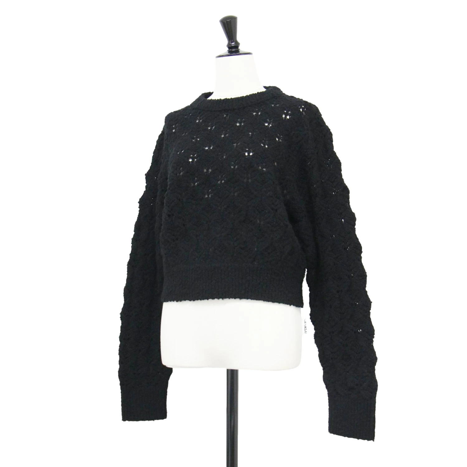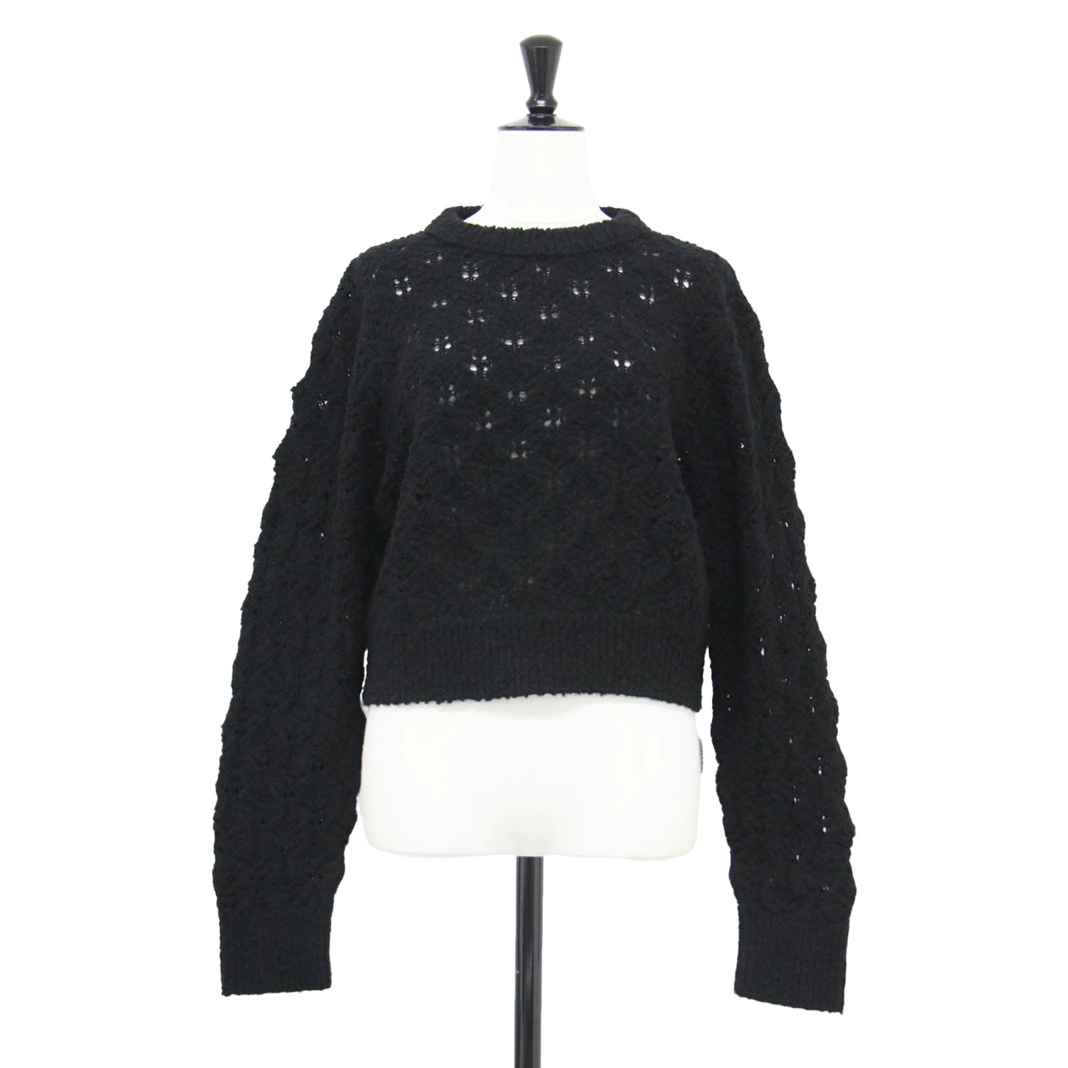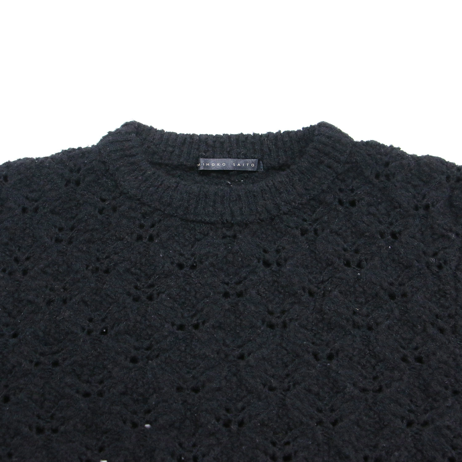 MIHOKO SAITO Knitwear, Black, Size: Free | Fall/Winter 2023 Openwork Crew Neck Knit | Pullover, Long Sleeves, Cropped Length, Mid-Gauge, Compact | Women's Sweater | Pre-owned | K4642