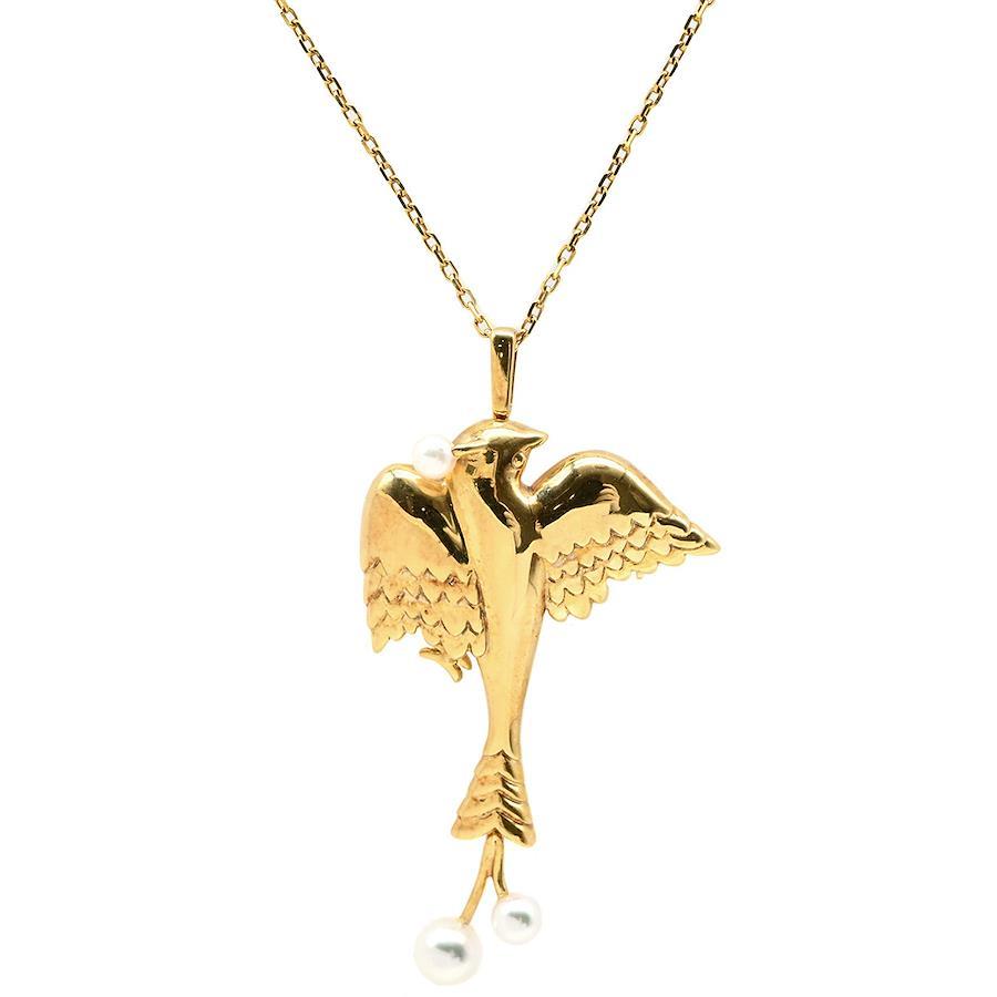 MIKIMOTO Necklace, Pearl Necklace, 18K Yellow Gold, MIKIMOTO Brooch, Pearl, 18K Gold, Au750, Bird Motif
