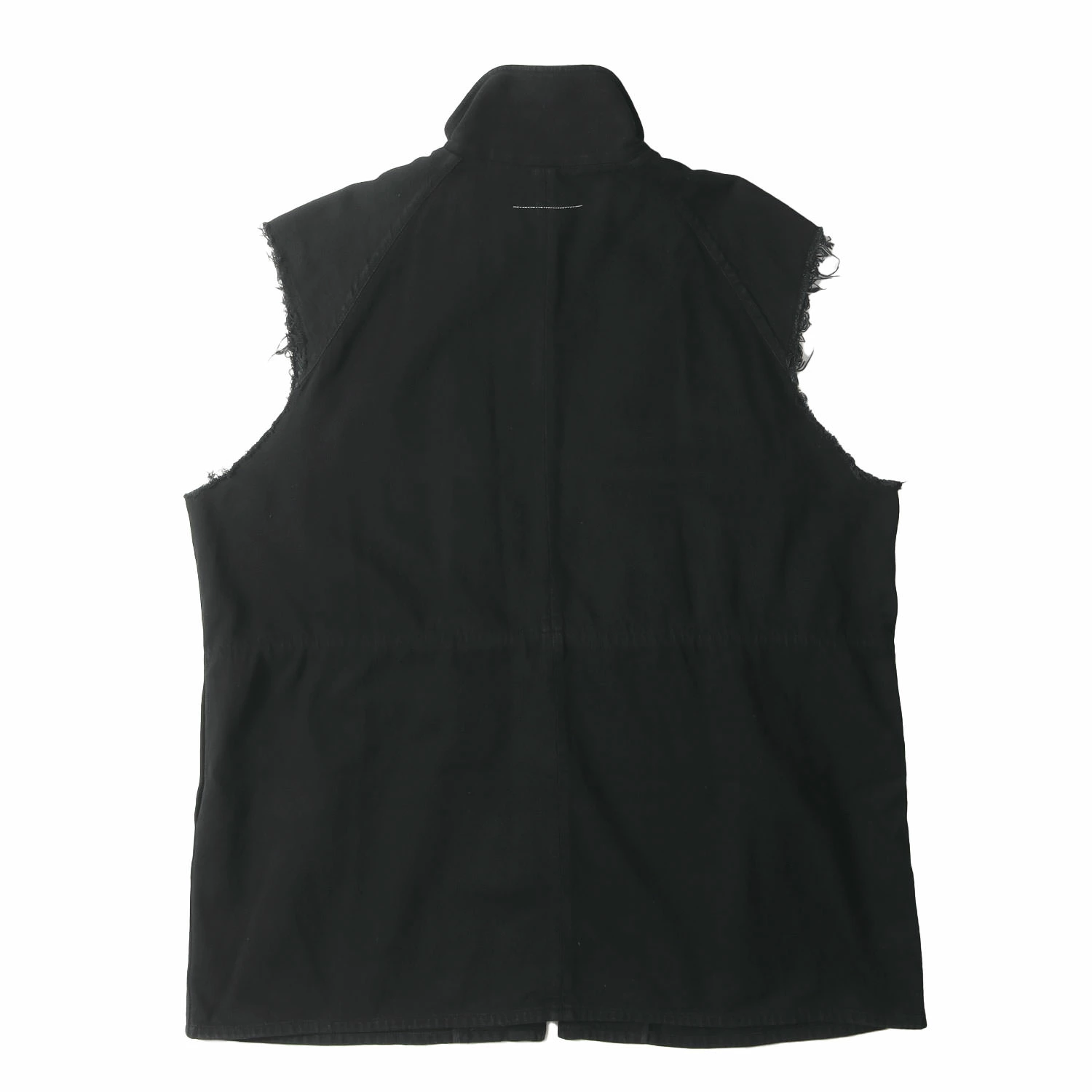 袖を切りっぱなしであしらったオーバーサイズシルエットのフルジップベストです。ボディにはヘビーオンスのコットンカツラギ生地を使用しております。