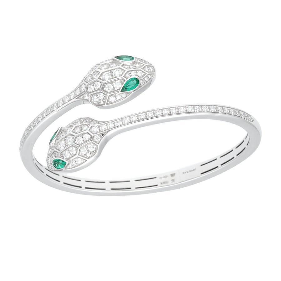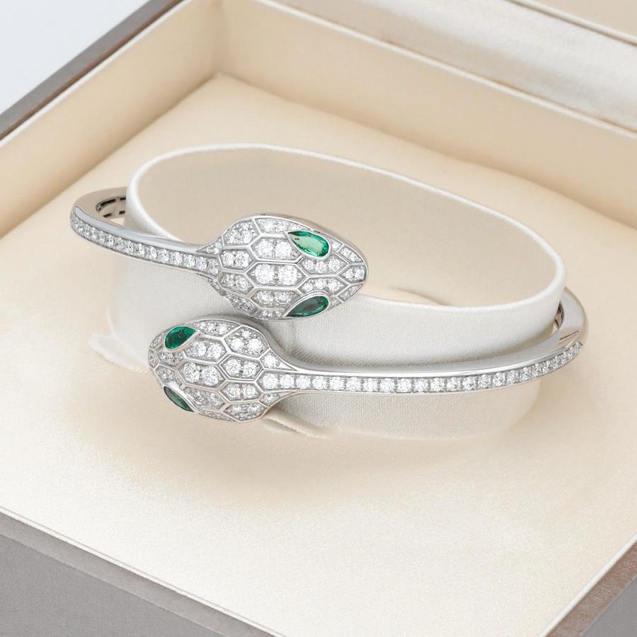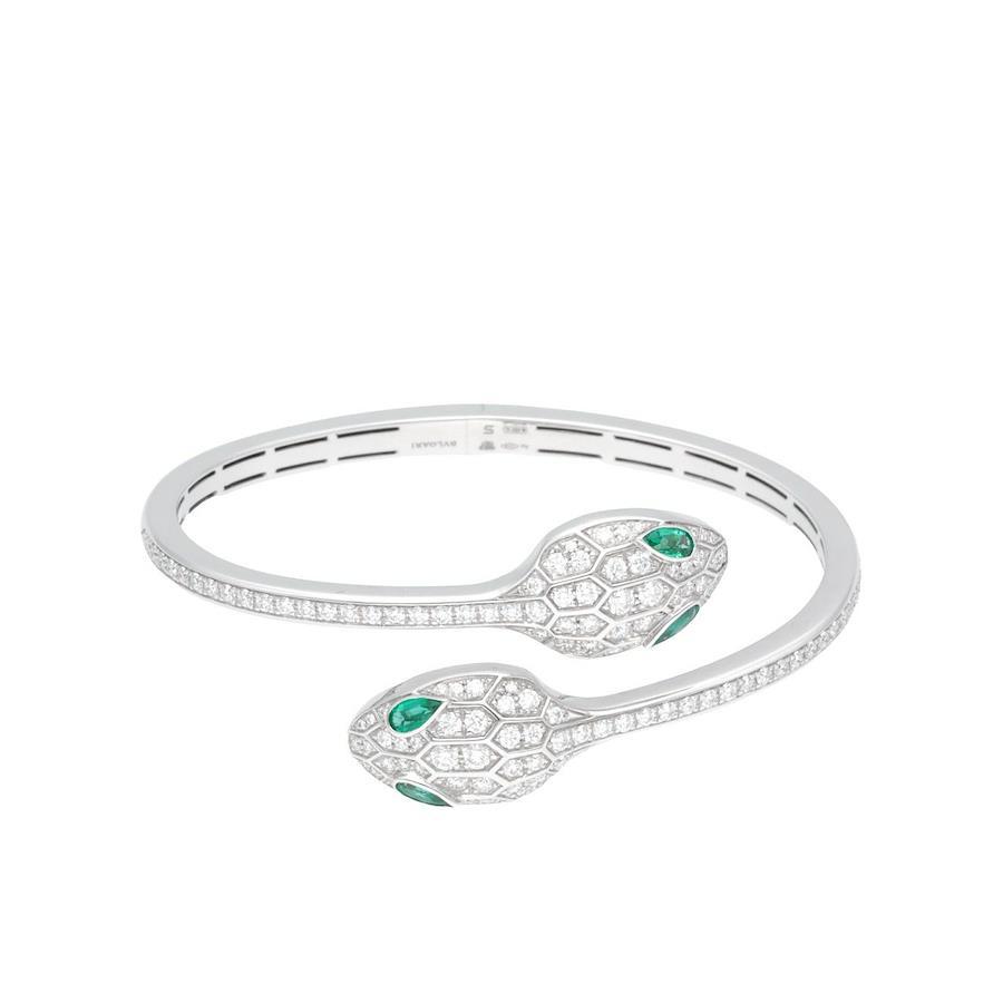 説明:神話に登場するヘビは、脱皮を繰り返すことで姿を変え、新たな力を手に入れる存在です。その変容する力にインスパイアされたブルガリの「セルペンティ」コレクションは、1948年の誕生以来、絶え間ない進化と再生のシンボルとして愛され続けています。このブレスレットは、18Kホワイトゴールドをベースに、繊細にセッティングされたパヴェダイヤモンドが輝きを放ち、エメラルドの瞳が印象的な存在感を添えています。時代を超えて魅了し続けるデザインには、ブルガリの卓越した職人技と快適な装着感が融合しています。