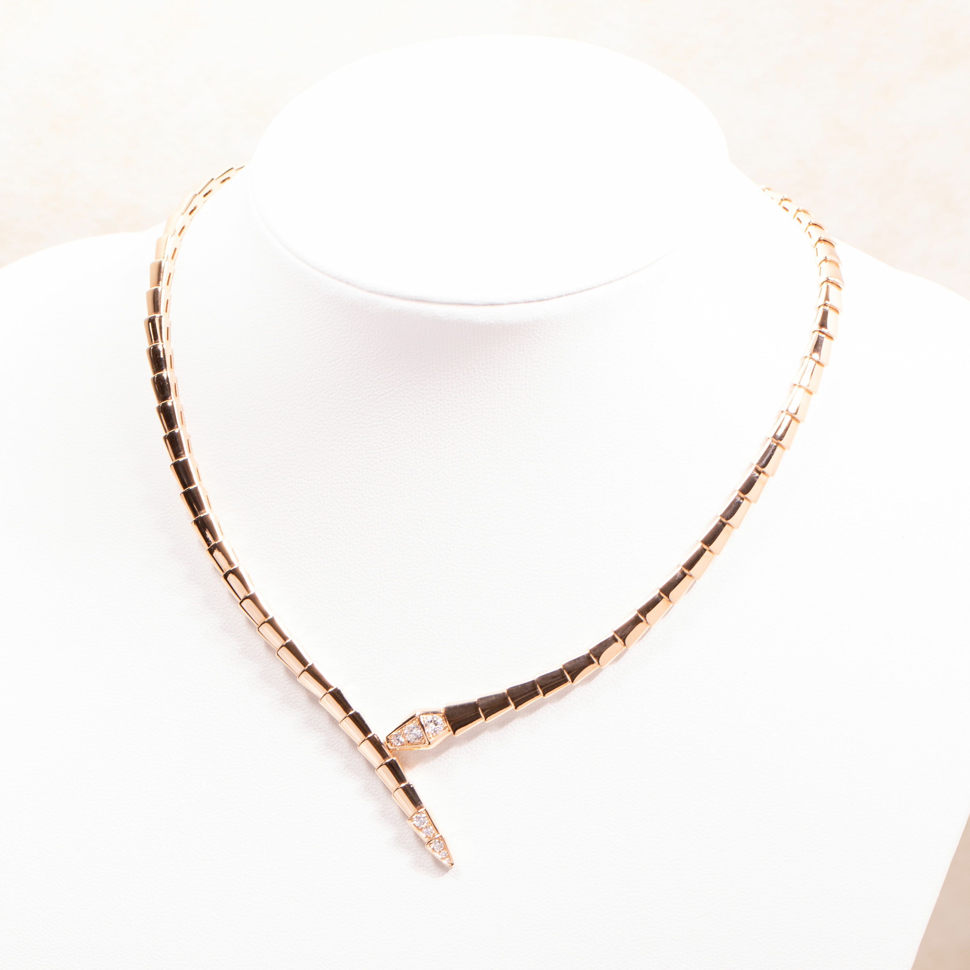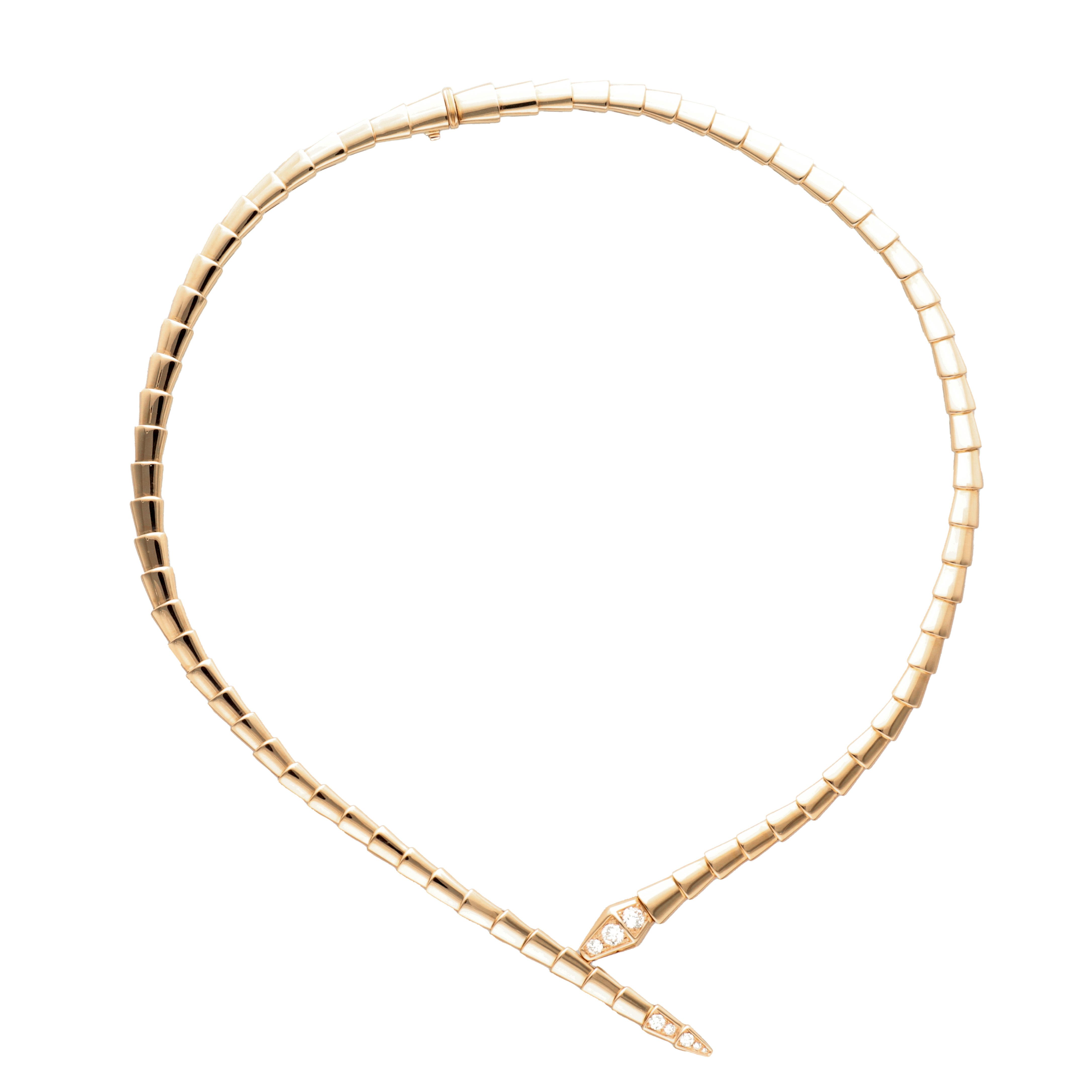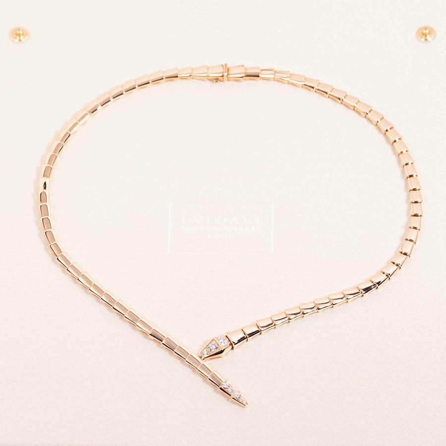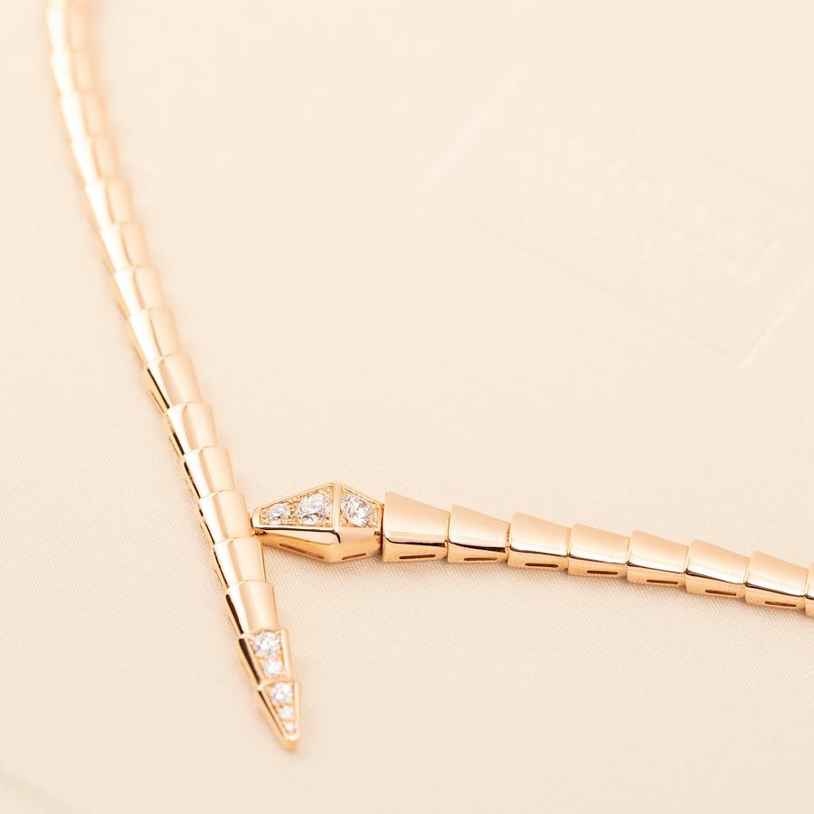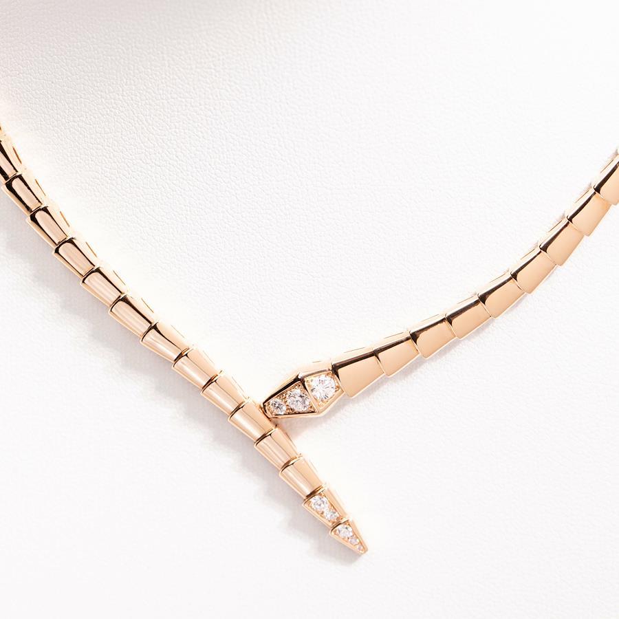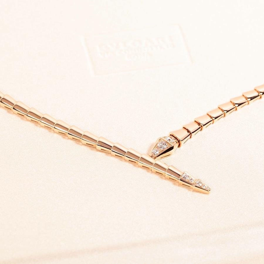 説明:優美なラインと存在感のあるデザインが印象的なセルペンティ ヴァイパー ネックレス。18Kピンクゴールドにパヴェダイヤモンドをあしらい、洗練された輝きを放ちます。古代の神話に登場する蛇の持つ変容と再生のイメージを映し出し、身につける人の内に秘めた強さや意志を引き出すジュエリーです。スタイルに合わせて自在に楽しめるデザインは、個性を尊重しながらも自由な美しさを表現するコレクションの精神を体現しています。