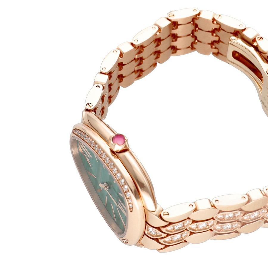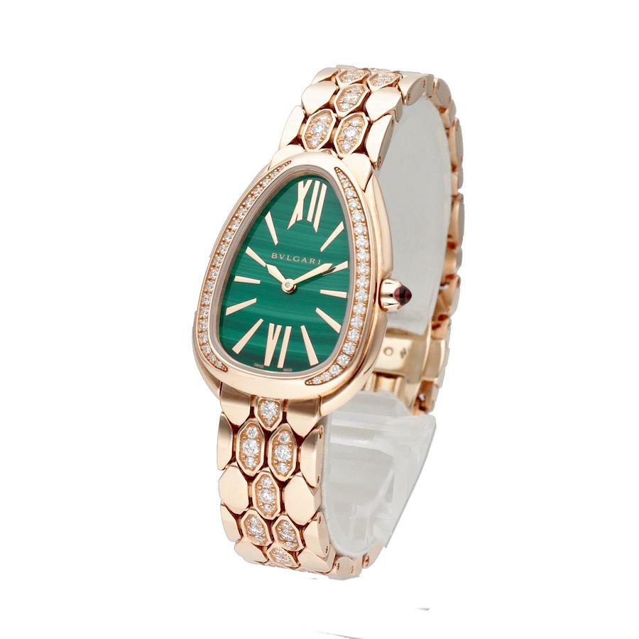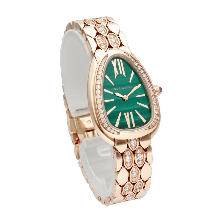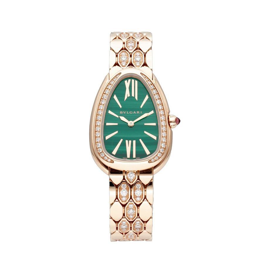 ブルガリ「セルペンティ セドゥットーリ 103835」は、官能的なフォルムと洗練されたデザインが融合したラグジュアリーウォッチです。印象的なマラカイトの文字盤が、深みのある色彩と天然石ならではの表情を見せ、手元に特別な存在感を与えます。