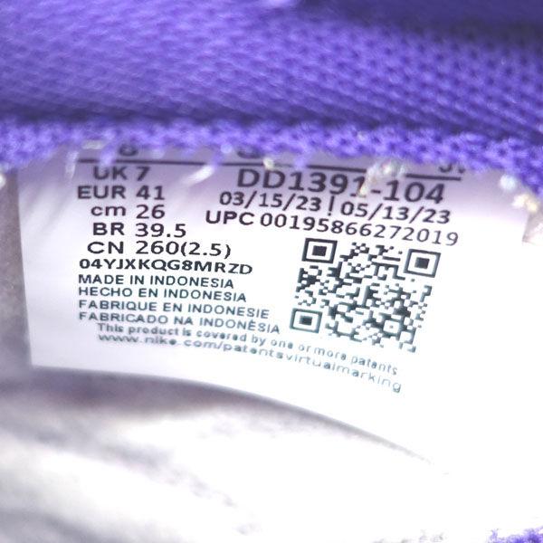 ・メーカー :NIKE / ナイキ・製品型番 :DD1391-104・サイズ :表記サイズ:8(26cm),アウトソール (約cm):28.5,甲の横幅 (約cm):10,ヒール/ソールの高さ (約cm):3,全高 (約cm):11,重量(片足) (約g):355,・色(柄)の系統:ホワイト パープル・デザイン :(メンズ)スニーカー (メンズ)26.0cm