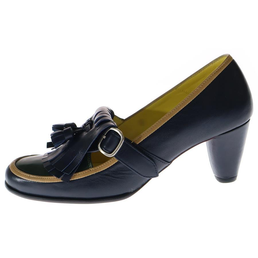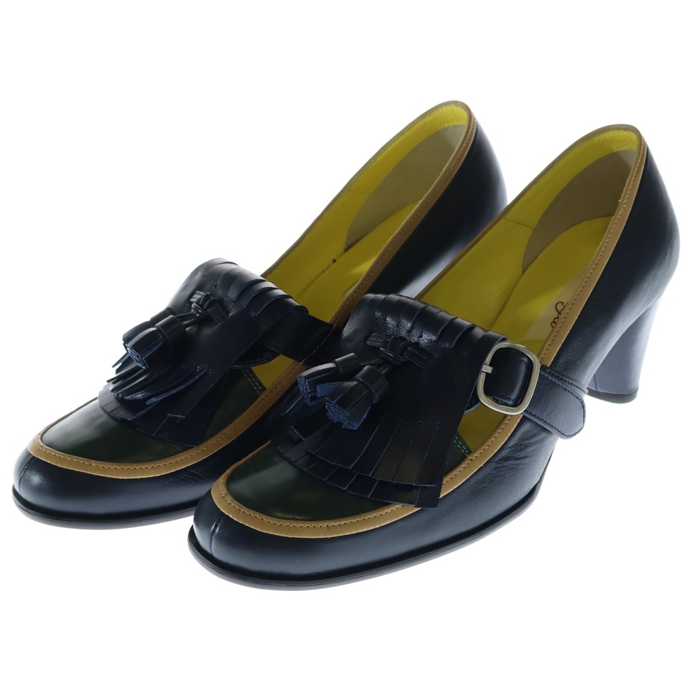[モデル]パンプス レザー タッセル フリンジ ヒール ローファー シューズ ネイビー レディース 〇