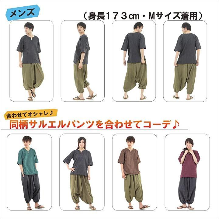 OKI(オキ)エスニックシャツストライプ5分丈メンズレディースユニセックスキーネックアジアン