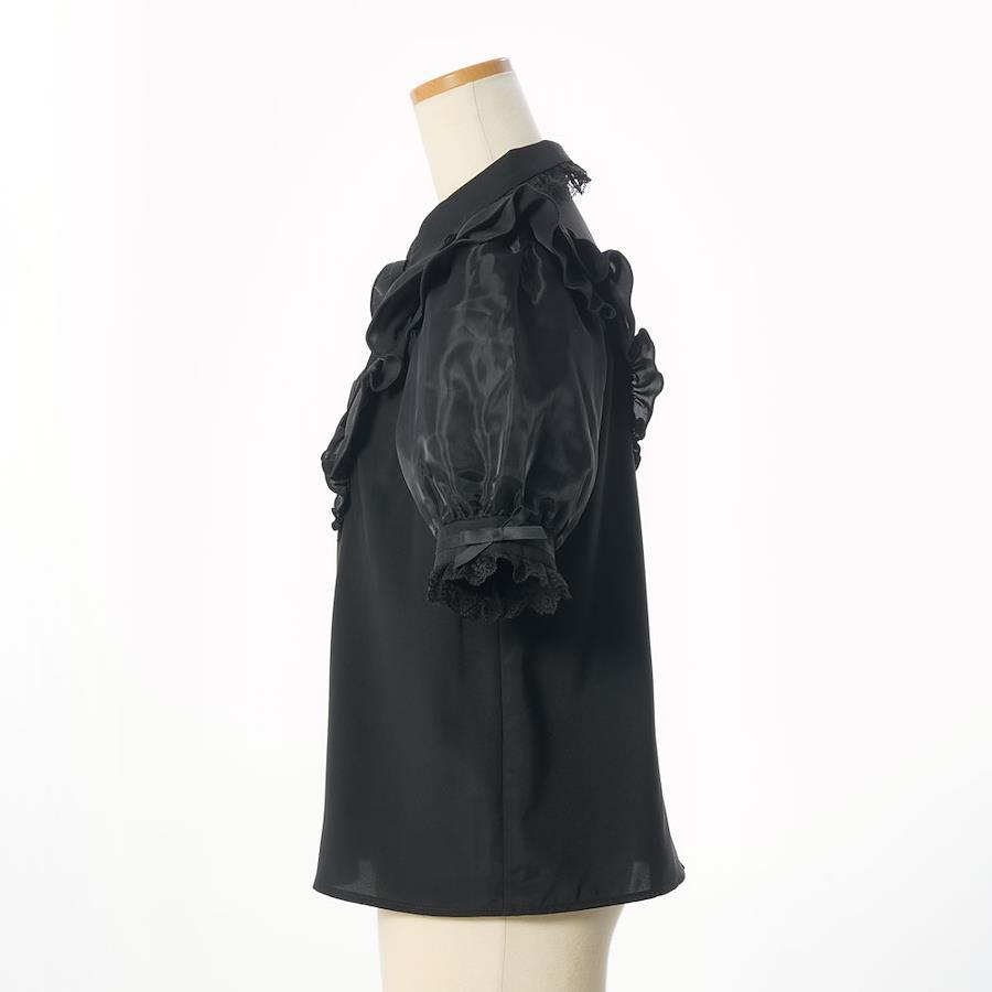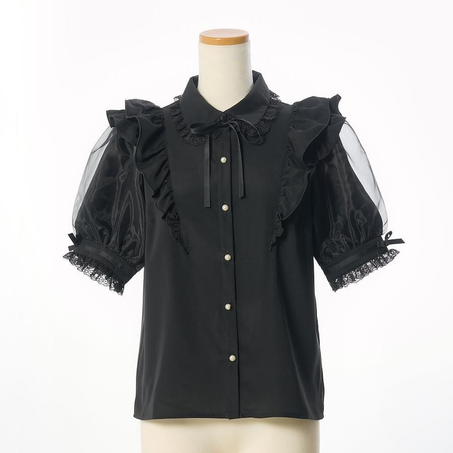 上品で大人可愛いガーリーブラウスのご紹介。【デザイン】王道フリルデザインとオーガンジーを重ねたお袖が可愛いブラウスです。フロントのパールボタンを開けて着脱する仕様です。付属のリボンタイはご自身で結んでいただくようになっています。お好みで取り外しも可能です。シアー素材を重ねたぽわっとしたお袖もかわいいポイント◎シンプルで色んなコーデに合わせやすいデザインなので、1枚持っていると着回し力抜群です。