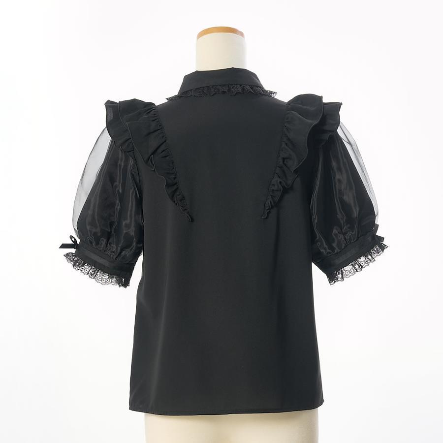 上品で大人可愛いガーリーブラウスのご紹介。【デザイン】王道フリルデザインとオーガンジーを重ねたお袖が可愛いブラウスです。フロントのパールボタンを開けて着脱する仕様です。付属のリボンタイはご自身で結んでいただくようになっています。お好みで取り外しも可能です。シアー素材を重ねたぽわっとしたお袖もかわいいポイント◎シンプルで色んなコーデに合わせやすいデザインなので、1枚持っていると着回し力抜群です。