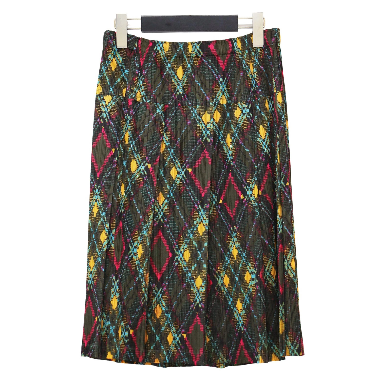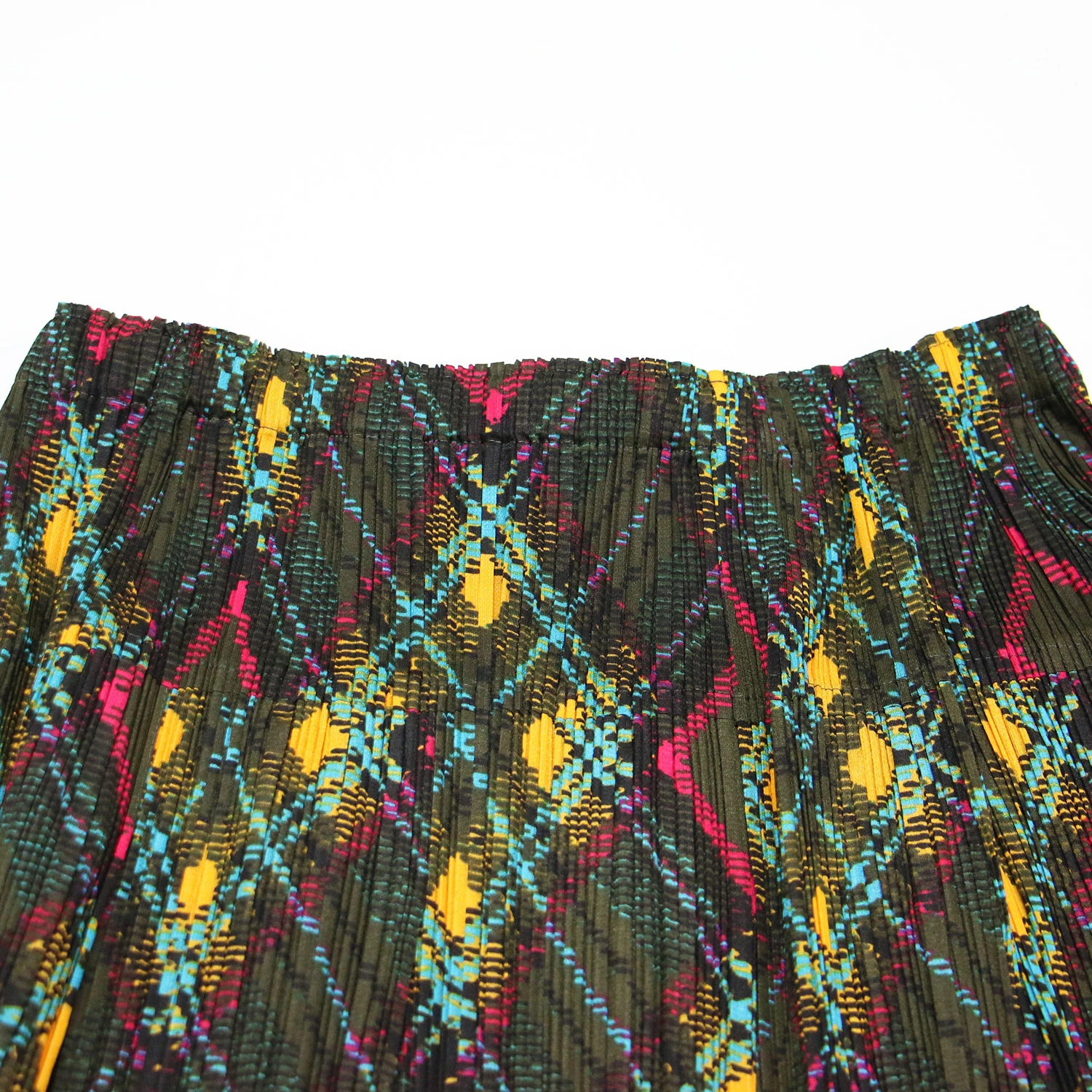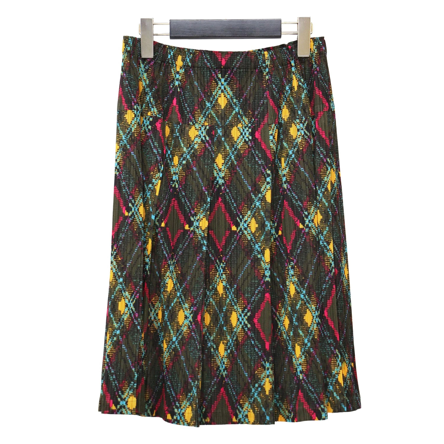 PLEATS PLEASE Skirt, Khaki, Size 5 (XXL) | All-Over Print Midi Pleated Skirt | Flared Tuck Argyle Print with Elastic Waist | Made in Japan | Women's Bottoms | Pre-owned | K4614