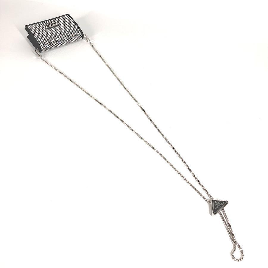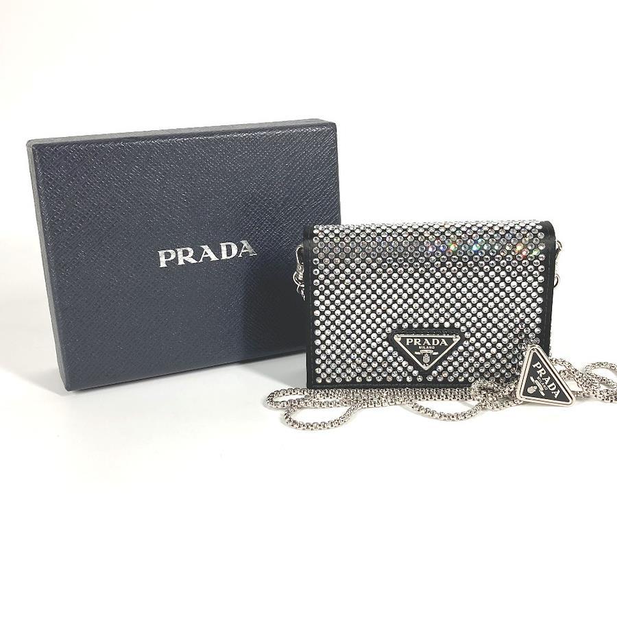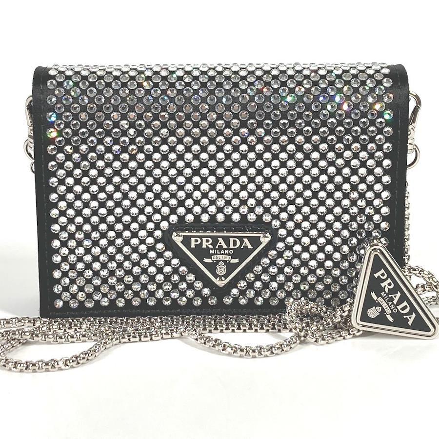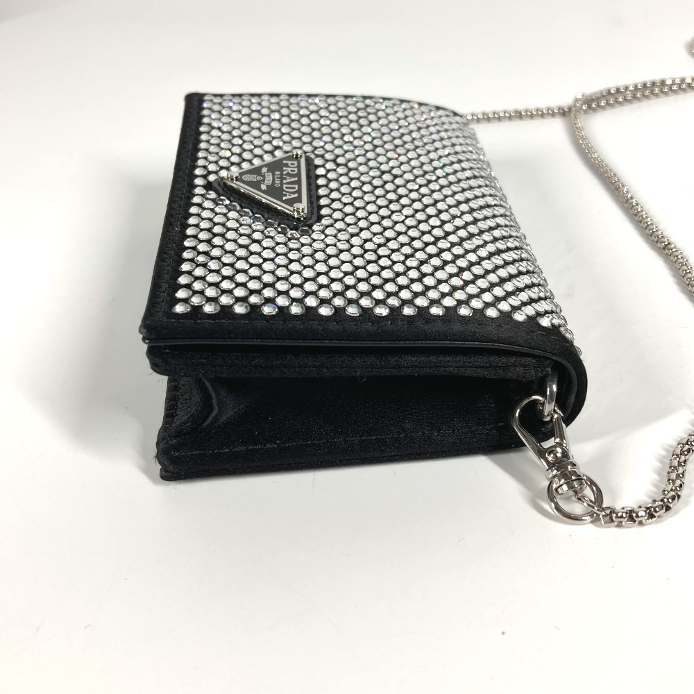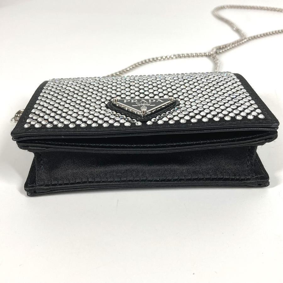 【商品説明】全体を覆うクリスタルが光の陰影と美しい輝きを生む、ラグジュアリーでありながら使い勝手に優れたサテンのカードケース。取り外し可能なチェーンのショルダーストラップ付で、さまざまな使い方でお楽しみいただけます。アイコニックなエナメルメタルのトライアングルロゴ付。