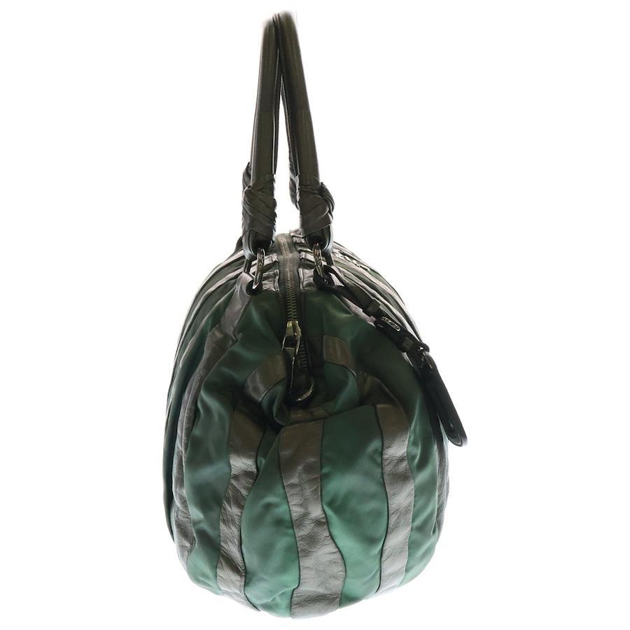 [モデル]クリムソン テスートナイロン レザー切り替え ストライプ ロゴプレート ハンドバッグ シルバー金具 カーキ/ブロンズ