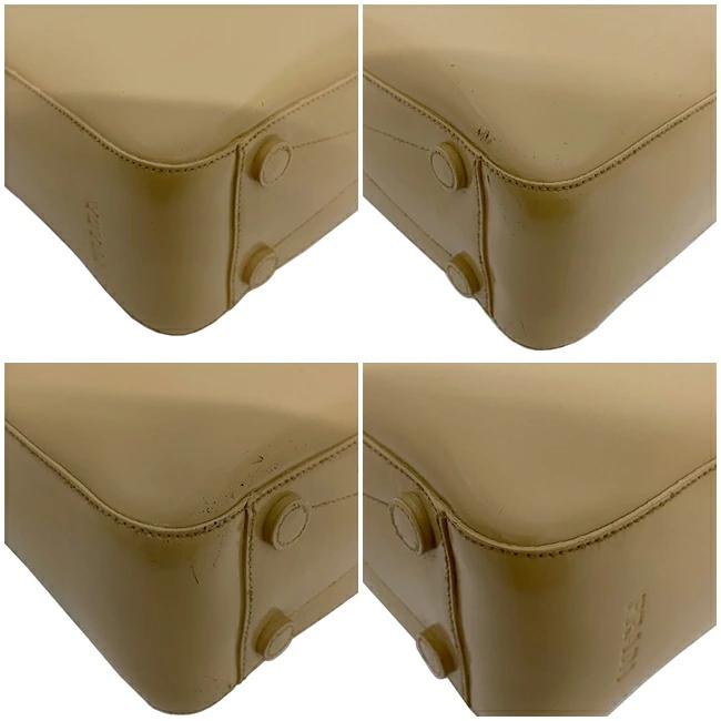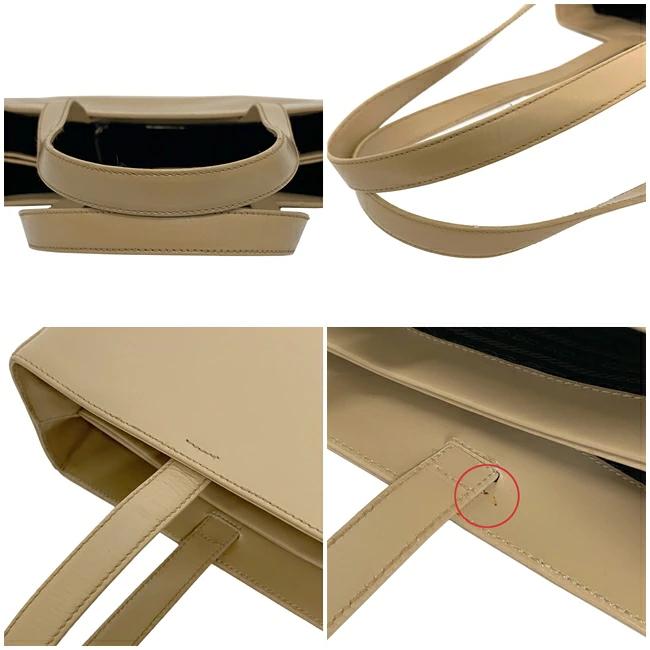 詳細説明:底部の角にスレ、底面に黒ずみ汚れ、ハンドルの付け根にシワ・一部にノリ染み、表面に傷や一部に汚れ、中央のポケットの上部フチに一部色剥がれ有、比較的綺麗なお品物ですのでまだまだお使い頂けます。