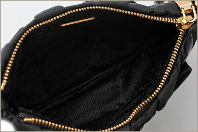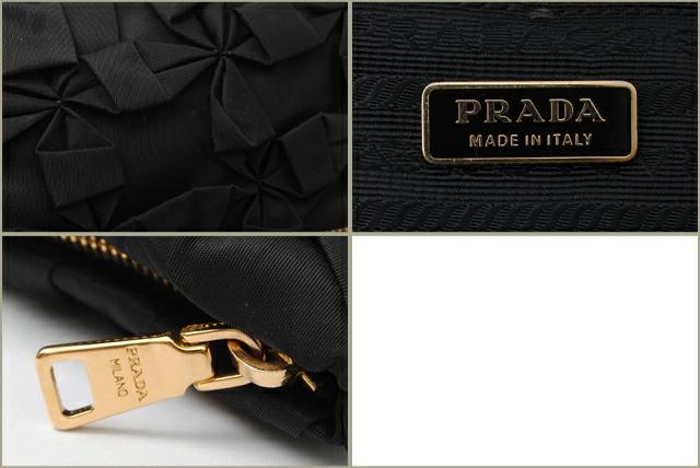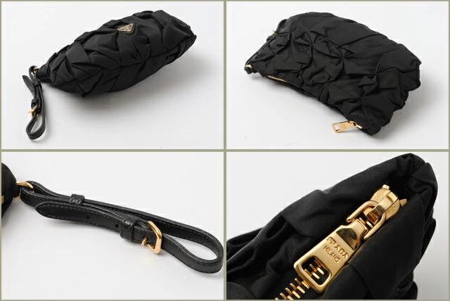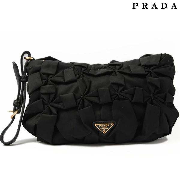 プラダより、全体に施されたフラワー柄のようなギャザーが入ったポーチ/クラッチバッグです。PRADA のトラインアングルプレートがアクセントになり高級感があります。機能性に優れたポーチで、手首を通せるハンドストラップ付です。クラッチバッグや、パーティーシーン、通常のポーチや、小物入れとしても使えます!