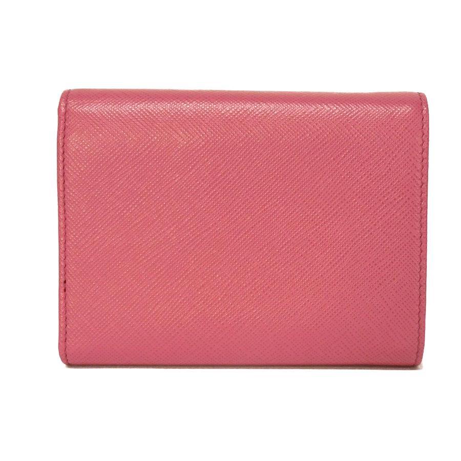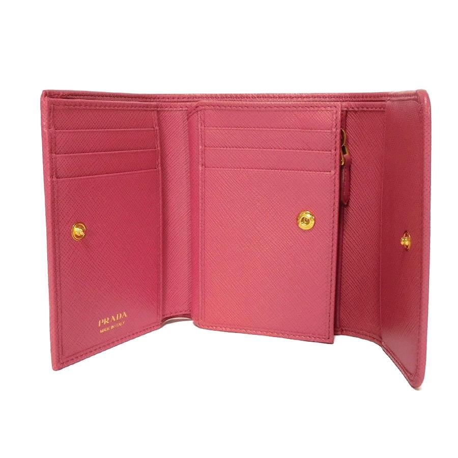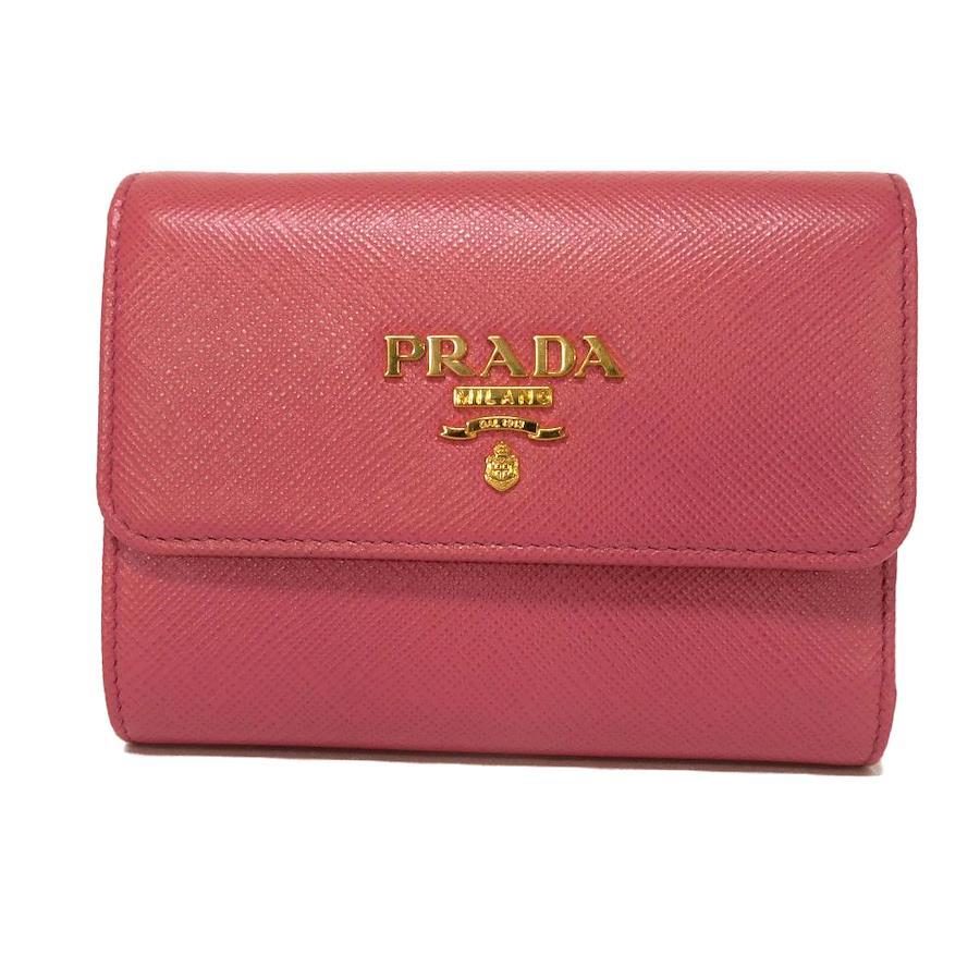 型押しカーフレザーにプラダのメタルロゴがあしらわれた「サフィアーノ コンパクト ウォレット」スナップ式三つ折り財布です。