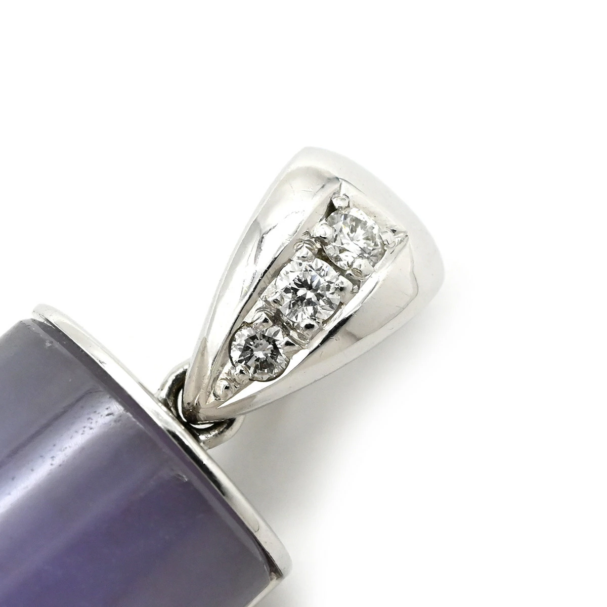 Pre-owned 18K lavender jadeite and diamond pendant necklace with mixed cabochon cuts in white gold and purple jadeite.