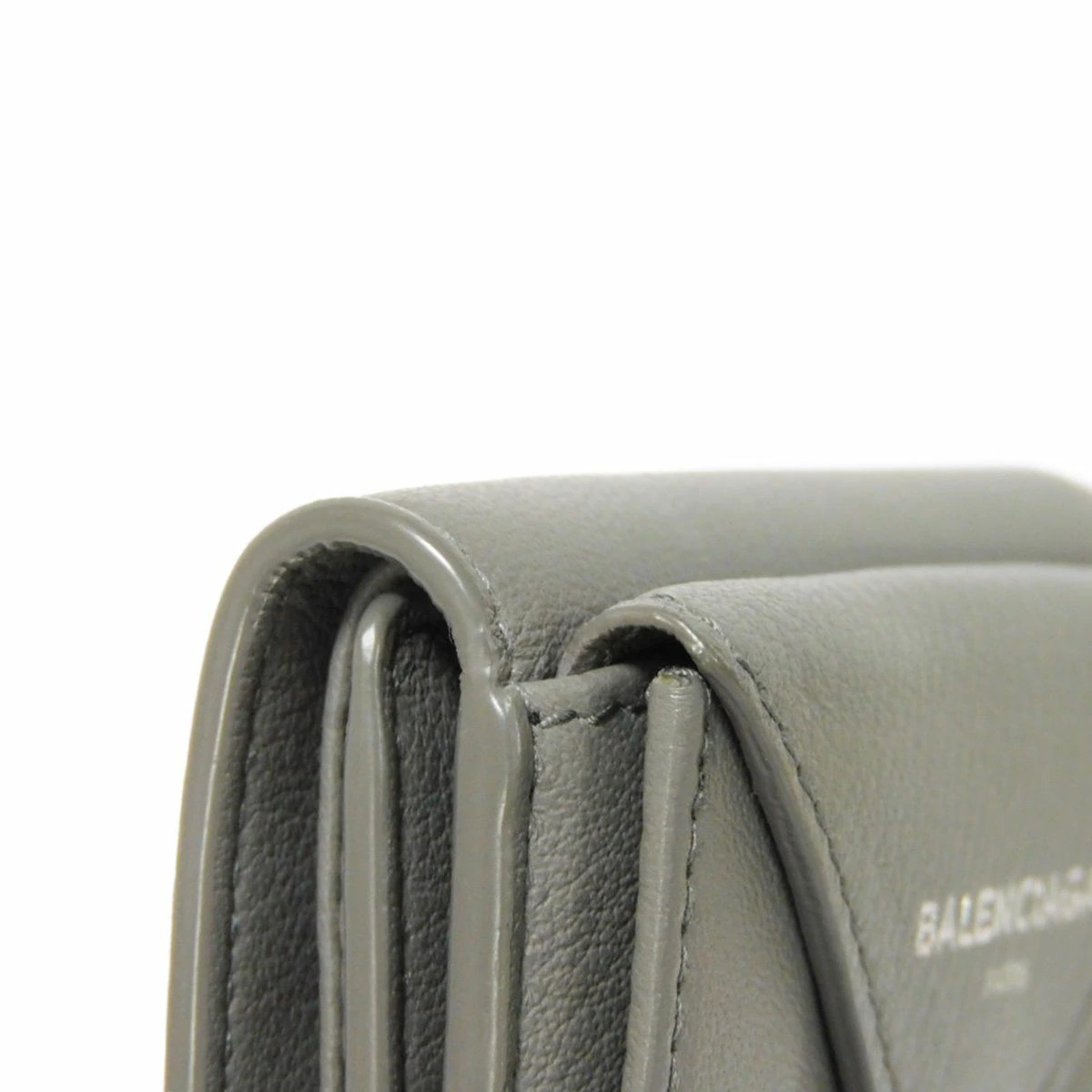 型押しが施された、カーフレザーにバレンシアガの箔押しロゴがあしらわれた「ペーパー ミニ ウォレット」コンパクトなスナップ式三つ折り財布です。 |
