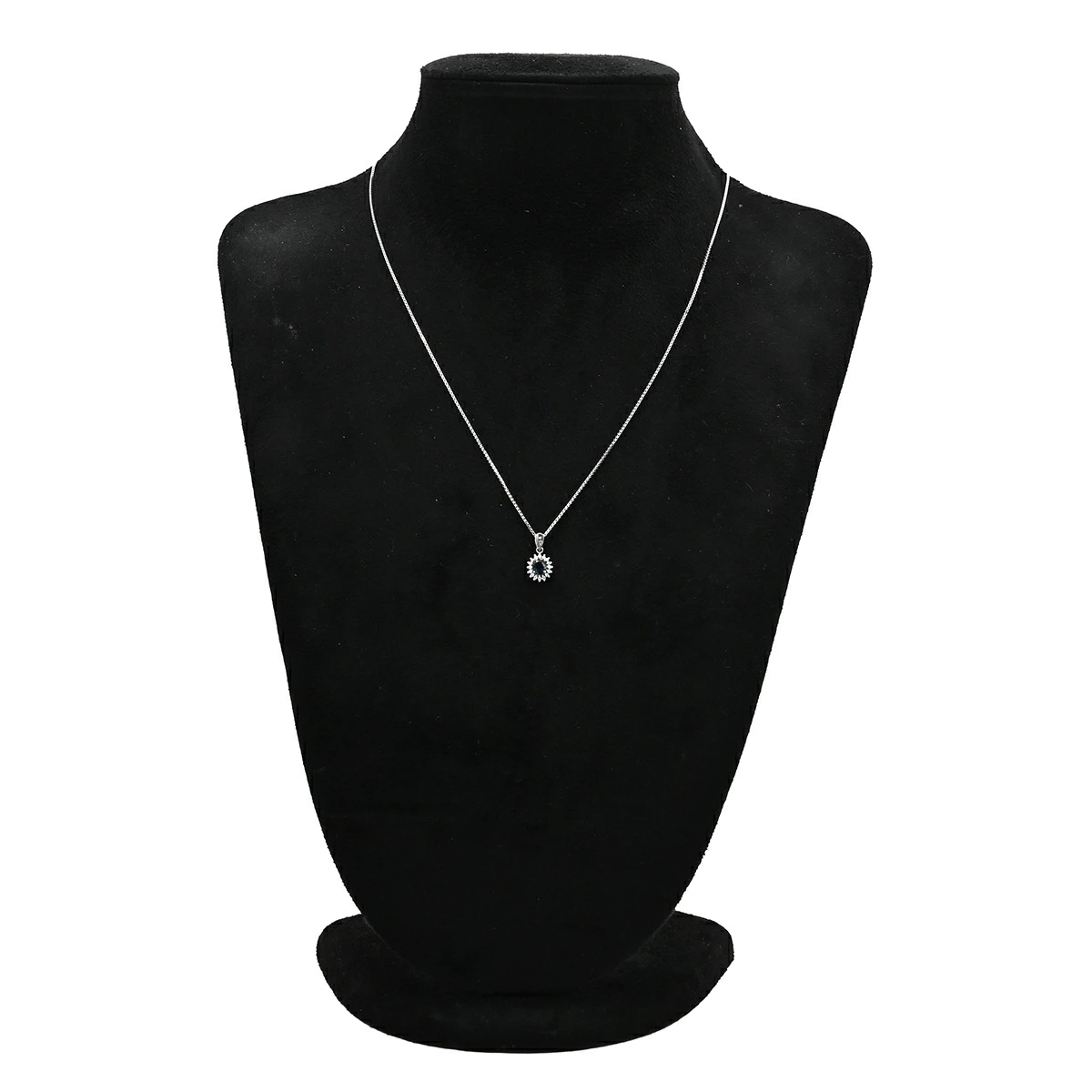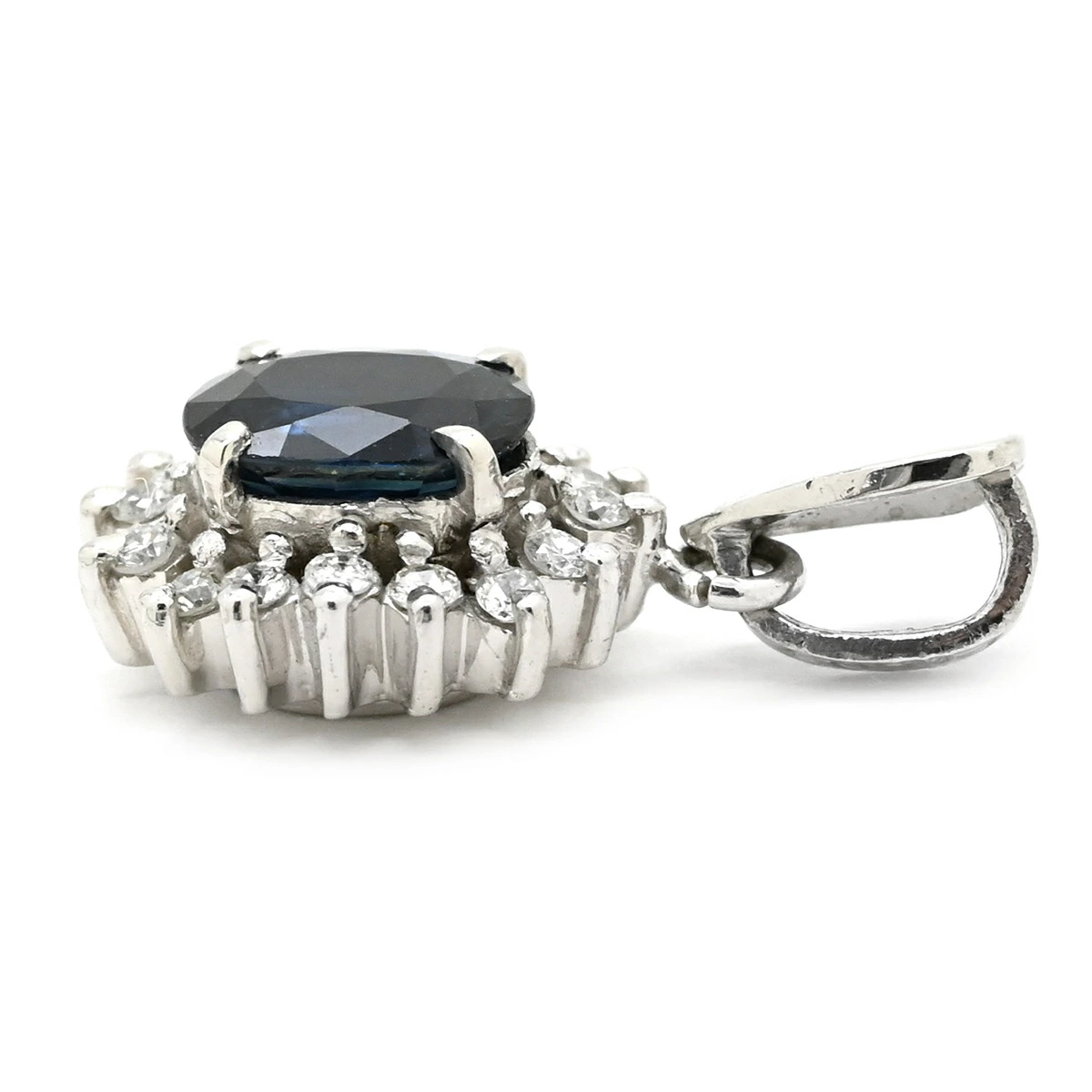 Pre-owned blue sapphire and 0.7ct diamond pendant in platinum and silver. Oval mixed cut pendant head necklace in Pt900.