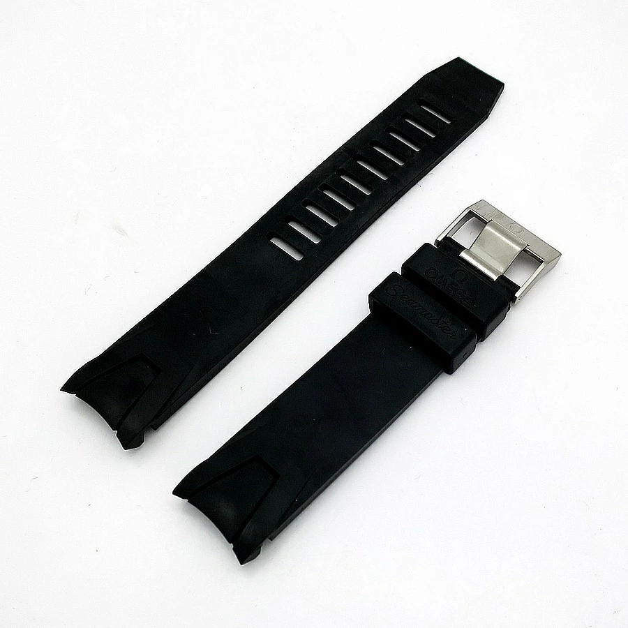 | オメガのラバーバンドです。サイズは(本体側)20mm、(バックル側)20mmです。メーカー純正のバックルが一緒についてきます。98000085。 |