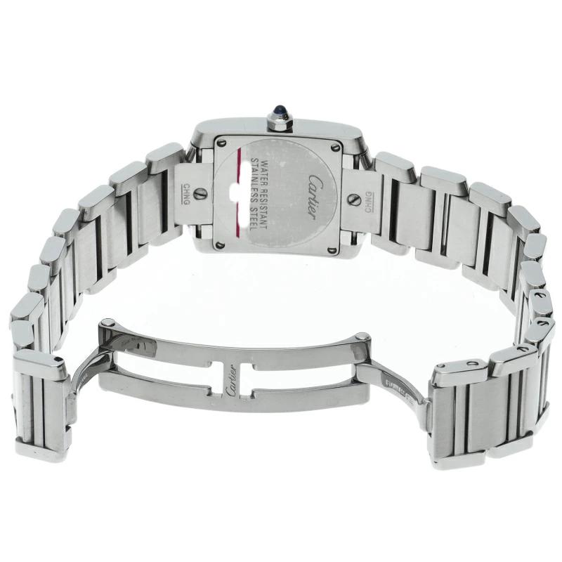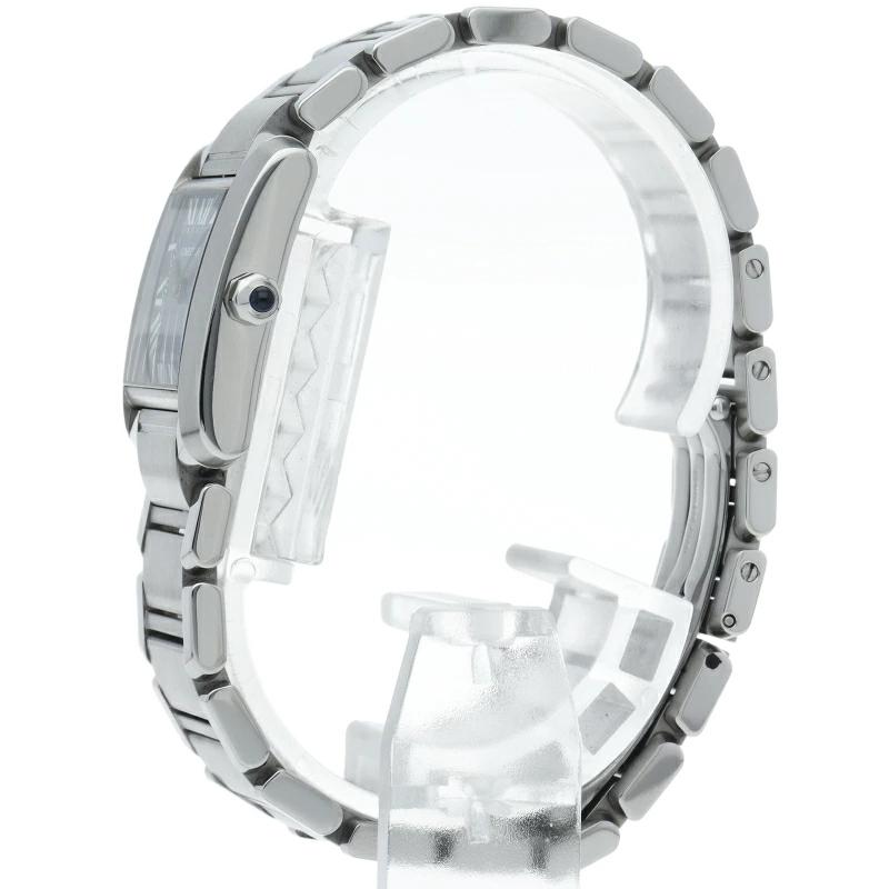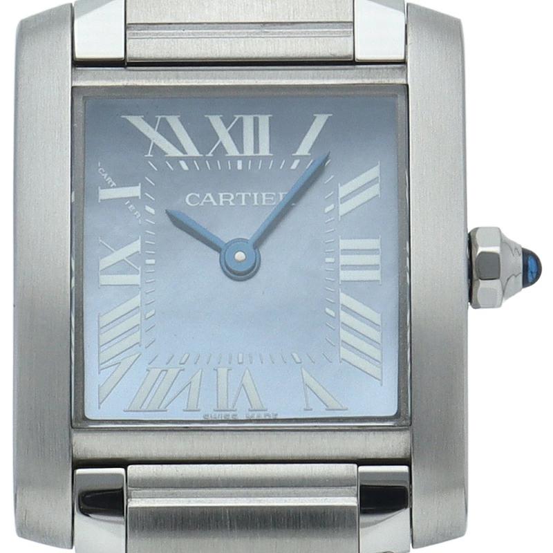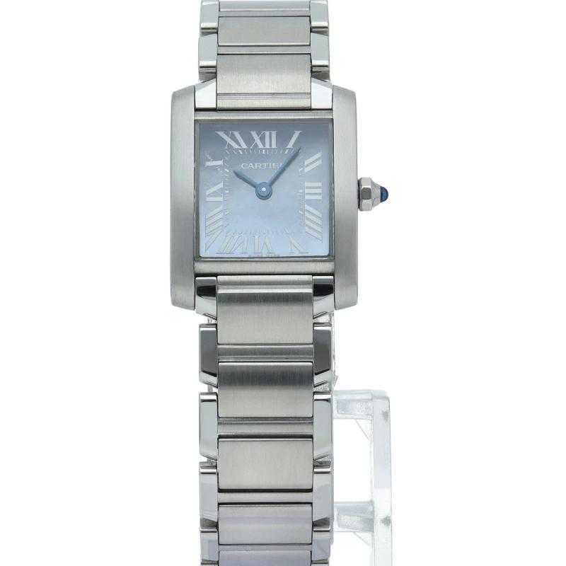 | カルティエの言わずと知れた人気シリーズ「タンクフランセーズ」。2008年に発売された、ブルーシェルダイヤルの商品です。シェルダイヤル特有のきらめきが高級感を感じさせます。 |