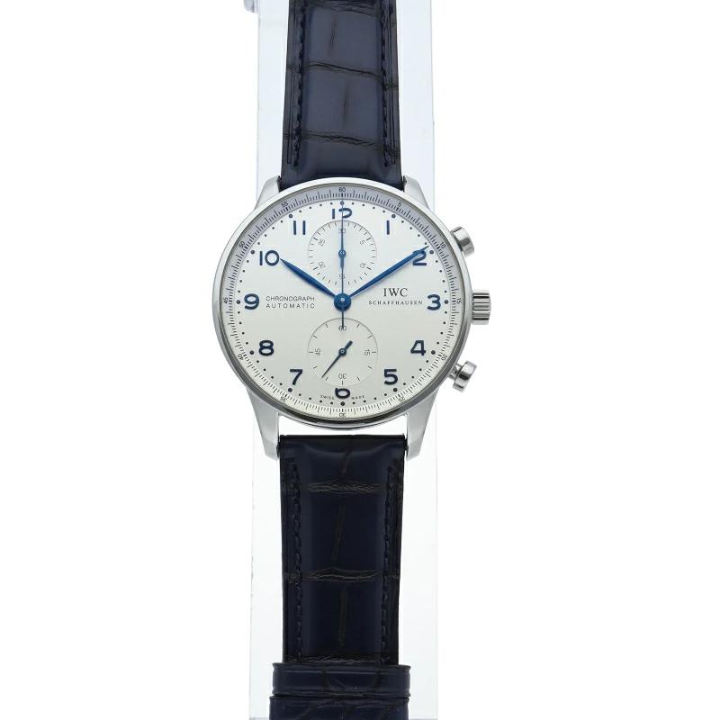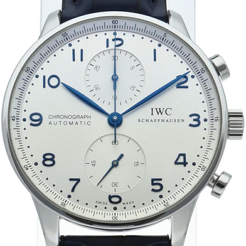 | IWCの中でも特に人気の「ポルトギーゼ」。ホワイト文字盤にブルースティール針の相性が良く、縦の2つのクロノグラフが上品かつクラシカルな1本。 |