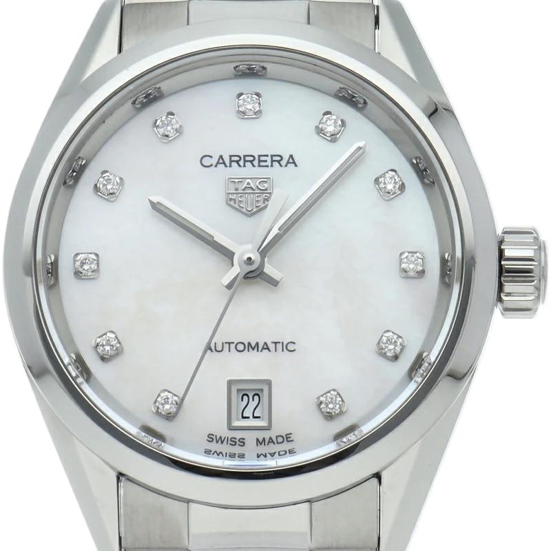 | カレラのレディースコレクションキャリバー9の2021年新作モデル。ケース径を28mmか29mmにサイズアップし、スポーティーなイメージになりました。文字盤には11ポイントダイヤをあしらえた、華やかな印象になった1本です。ケースはシースルーバックになっており、自動巻きムーブメントの動きを堪能することができます。 |