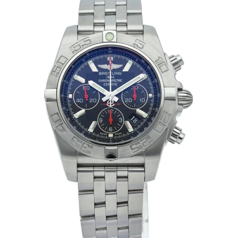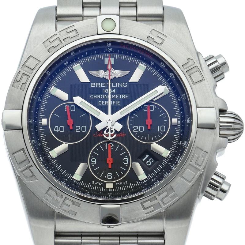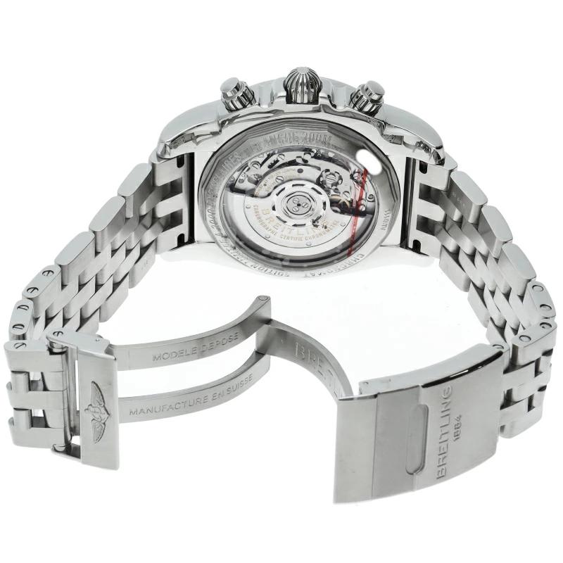 | ブライトリングの完全自社開発・自社製造クロノグラフ「キャリバー01」搭載。レギュラーラインは500m防水ですが、こちらの限定モデルはシースルーバックのため200mと控えめな防水仕様となります。AB0111/AB011110/BA50。 |