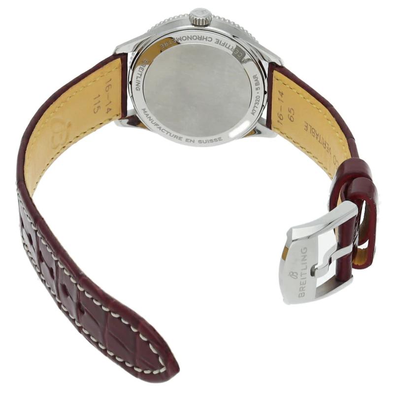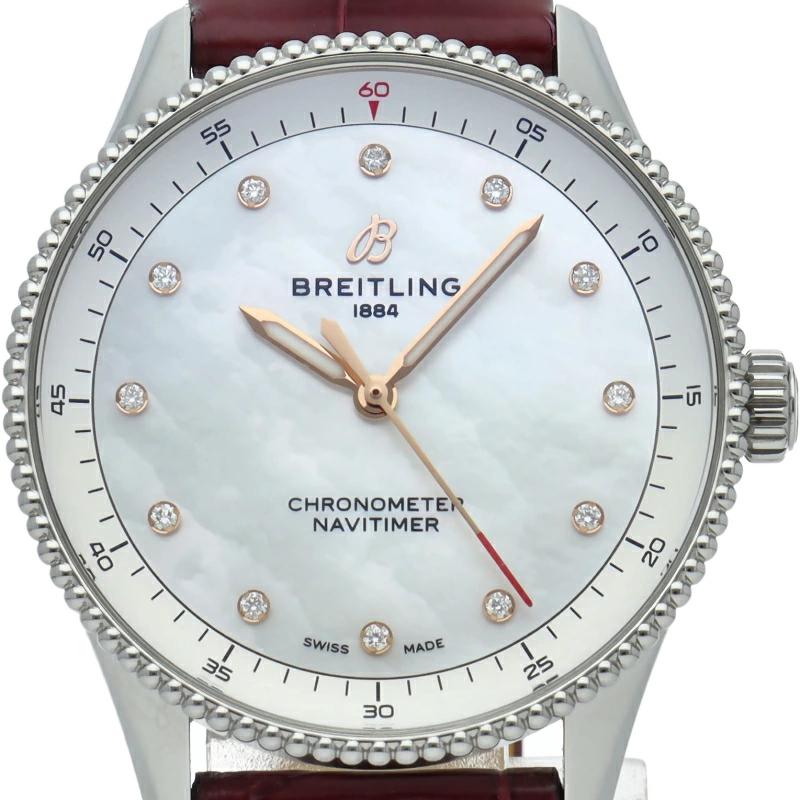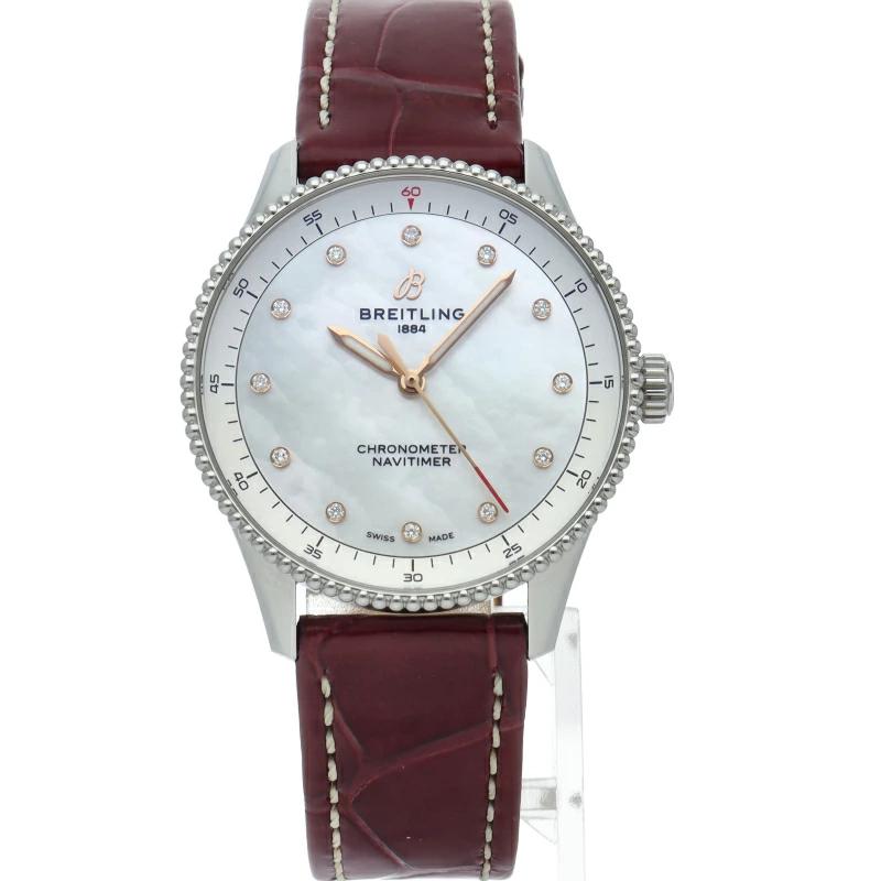 Pre-owned Breitling Navitimer 32 Watch with 12 Diamonds and Shell, Navitimer Automatic 32, A77320/A77320E61A2P2, Stainless Steel/Leather, Unisex, Silver, with Box and Warranty.