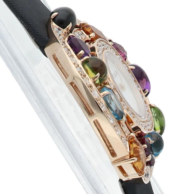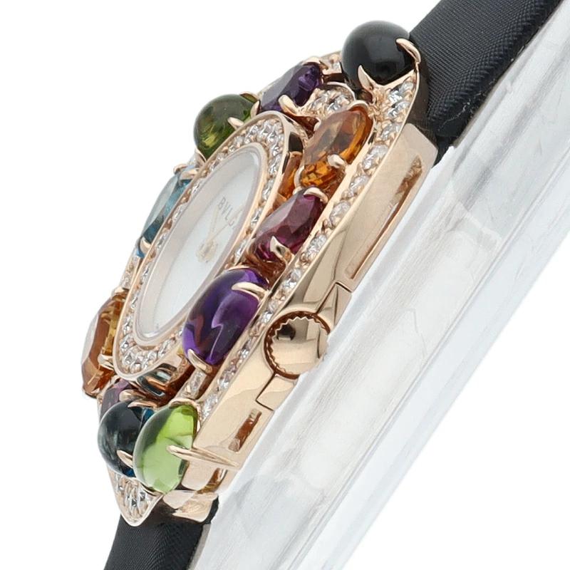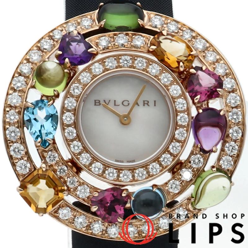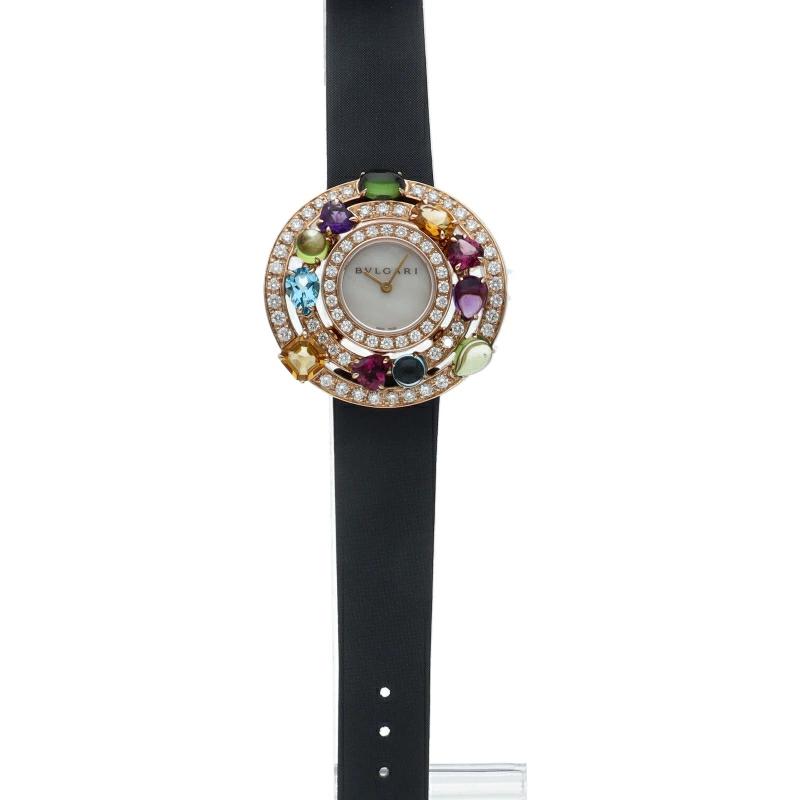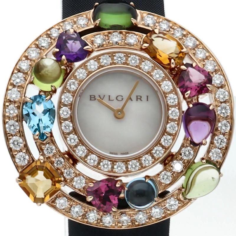 | ブルガリの人気コレクション、チェルキ。サイズの異なるカラーストーンが大胆にセッ-トされており、色石を繋ぐダイヤモンドがまるで惑星の軌道を描いているかのようなデザ-インです。アストラーレとも呼ばれており、その名の通り星を想起-させるデザインになっています。独創的で高いデザイン性を誇るブルガリならではのラグ-ジュアリーウォッチです。 |