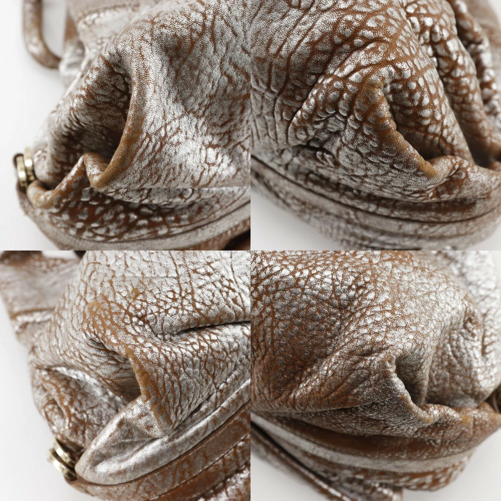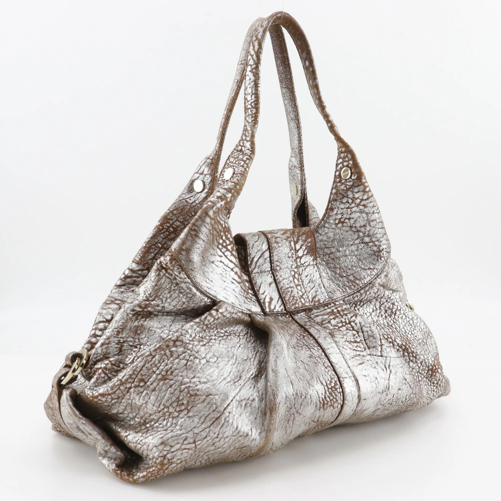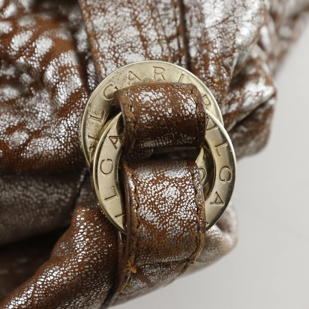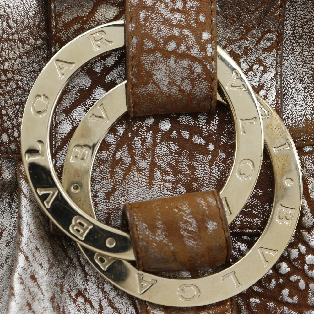 Pre-owned Bulgari Chandra leather tote bag in silver/brown, shoulder/handbag style, A5 size, with magnetic closure.