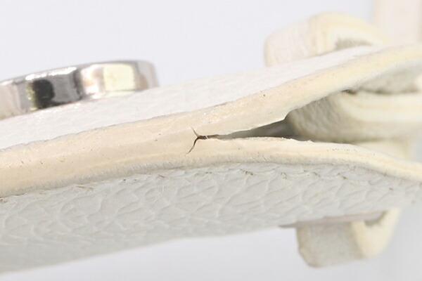 状態 | 外側:所々スレ・小汚れあり。ホルダーに使用跡の膨らみあり。ストラップフチ(コバ)に薄黄ばみ・ヒビ割れ多数あり。。 内側:薄汚れあり。フチにボンドヨゴレあり。 金具:微細なキズ、側面にクスミあり。 |