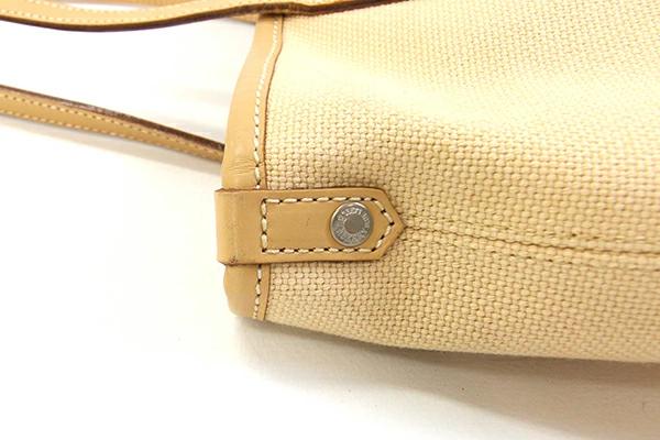 状態外側:キャンバス地全体的に薄汚れ、所々薄色汚れ・薄染みあり。底角はスレによる色褪せあり。レザー部分にも薄汚れ、フチにコーティング割れあり。