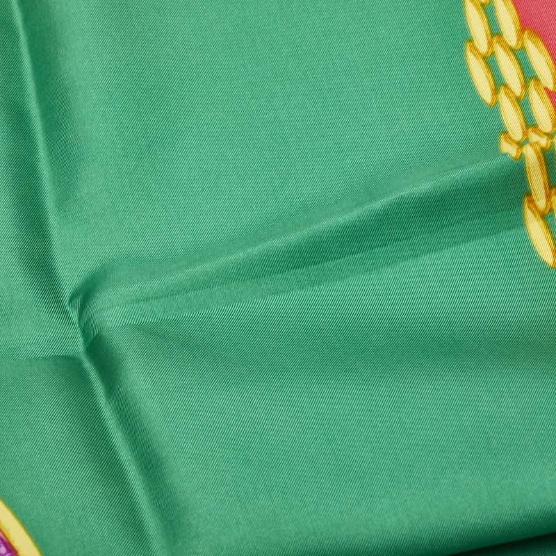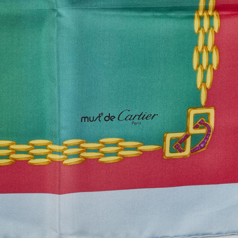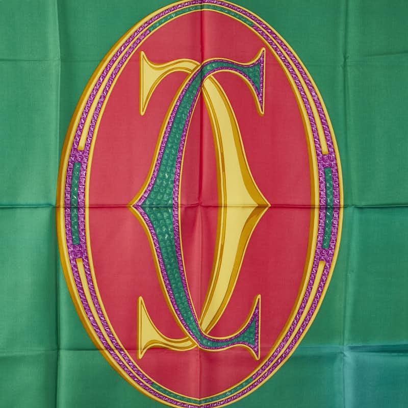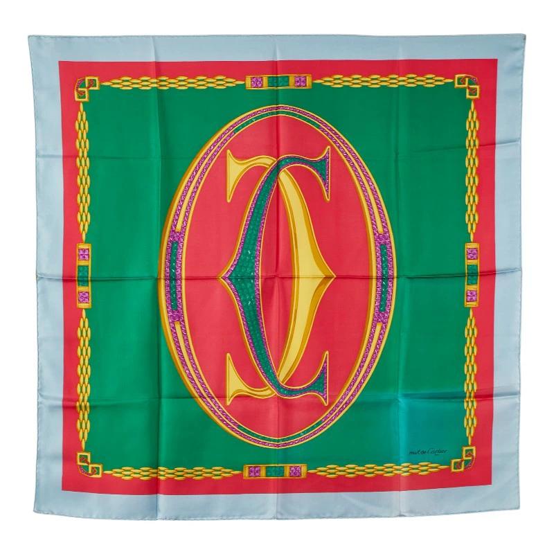 Pre-owned Cartier logo scarf in red, green, and yellow silk.