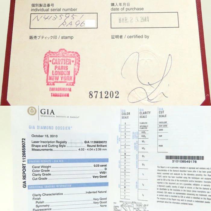 | | 重量 | 3.6g | | 付属品 | 保証書(2011年発行)、鑑定書 (GIA発行 | | 備考 | ダイヤモンド 0.23ct 直径4mm D/VVS1/VeryGood