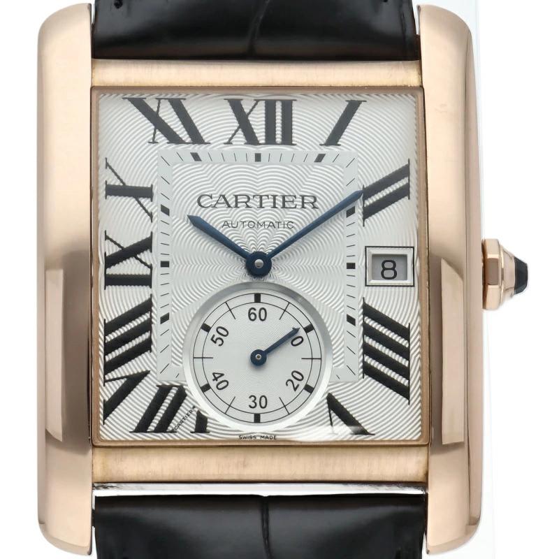 カルティエ「タンクMC」(W5330001)。タンクの優美さに力強いケースフォルムを融合させたメンズ専用モデルです。18Kピンクゴールドの艶やかな輝きが、手元に圧倒的な色気と品格を演出。裏蓋からは自社製ムーブメントを鑑賞でき、スモールセコンドを備えた精悍な表情が、大人の自信を裏付ける本格機械式時計です。