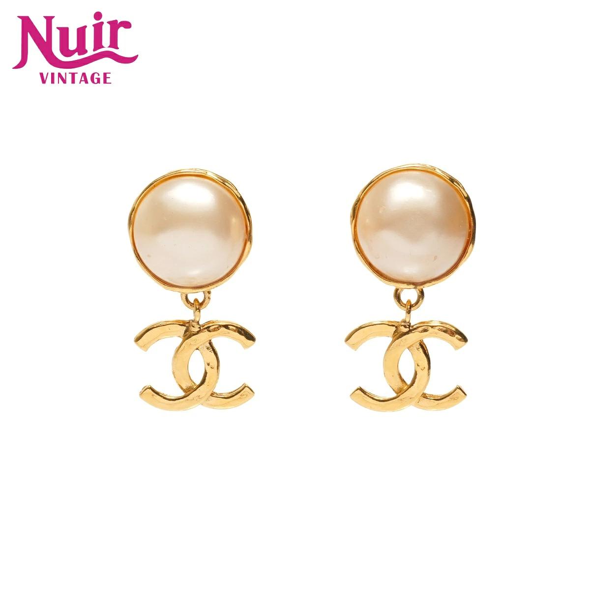 Pre-owned Chanel 93A 1993 Coco Mark Pearl Drop Earrings in Gold (WS25356)