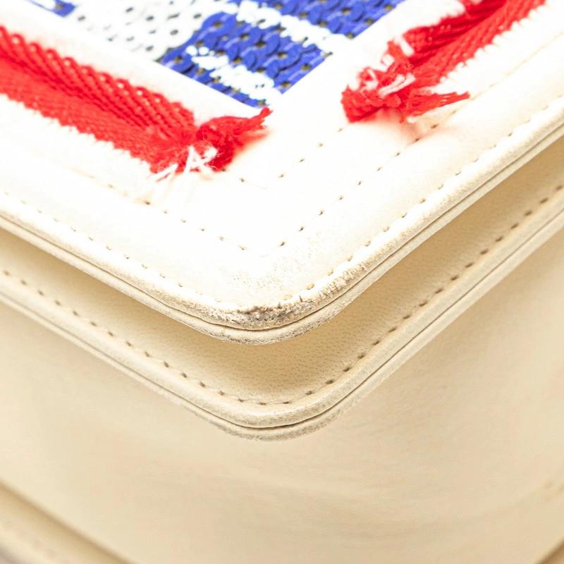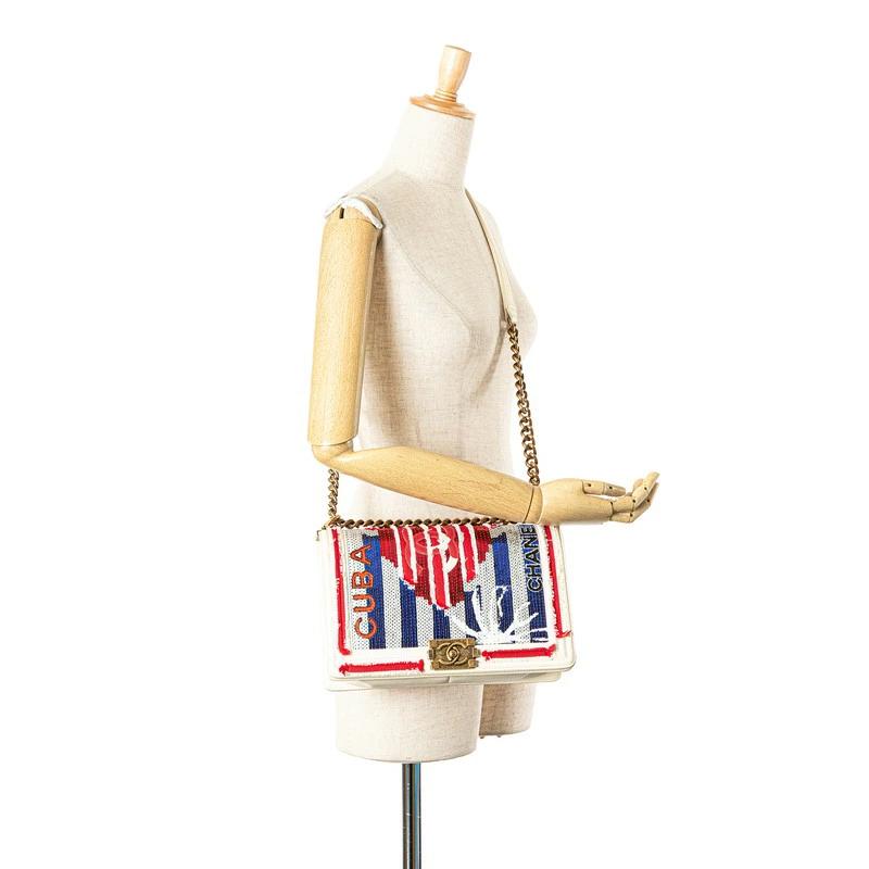 Pre-owned Chanel Boy Chanel Coco Mark CUBA Chain Shoulder Bag in White, Red, and Multicolored Lambskin and Sequin Canvas.