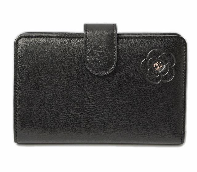 シャネルより、ワンポイントのカメリアがアクセントの折財布です。洗練されたデザインに可愛らしさをプラス。