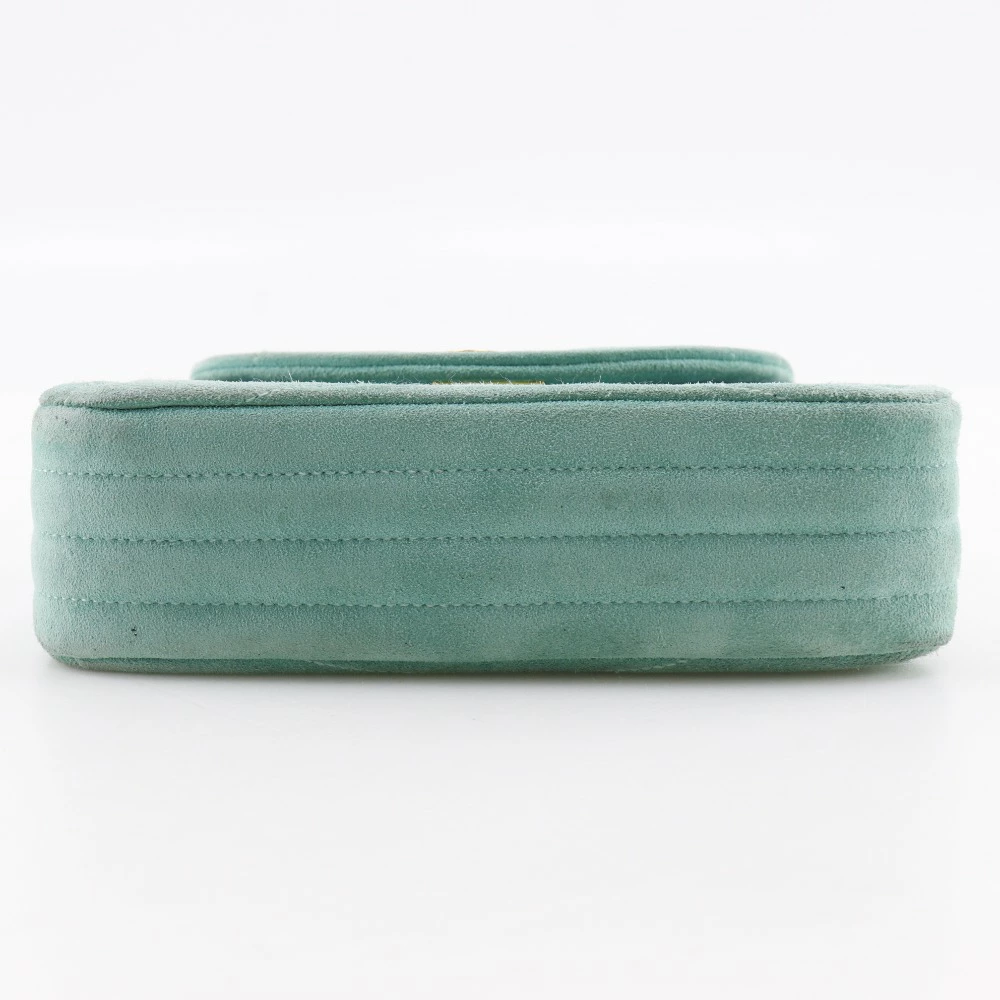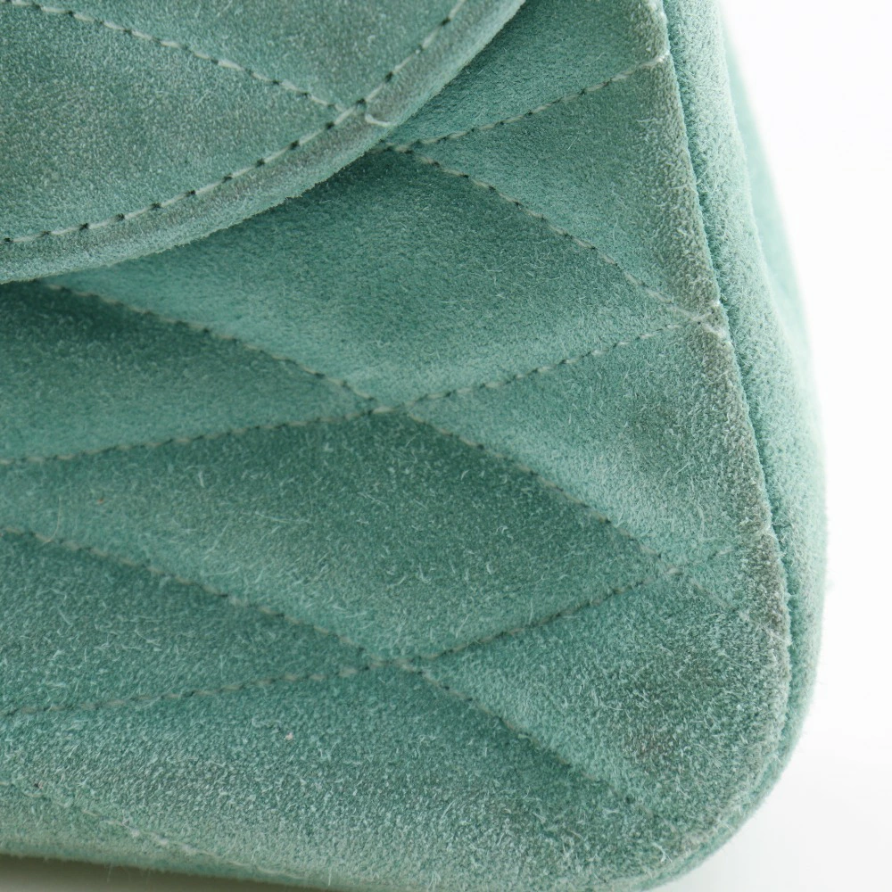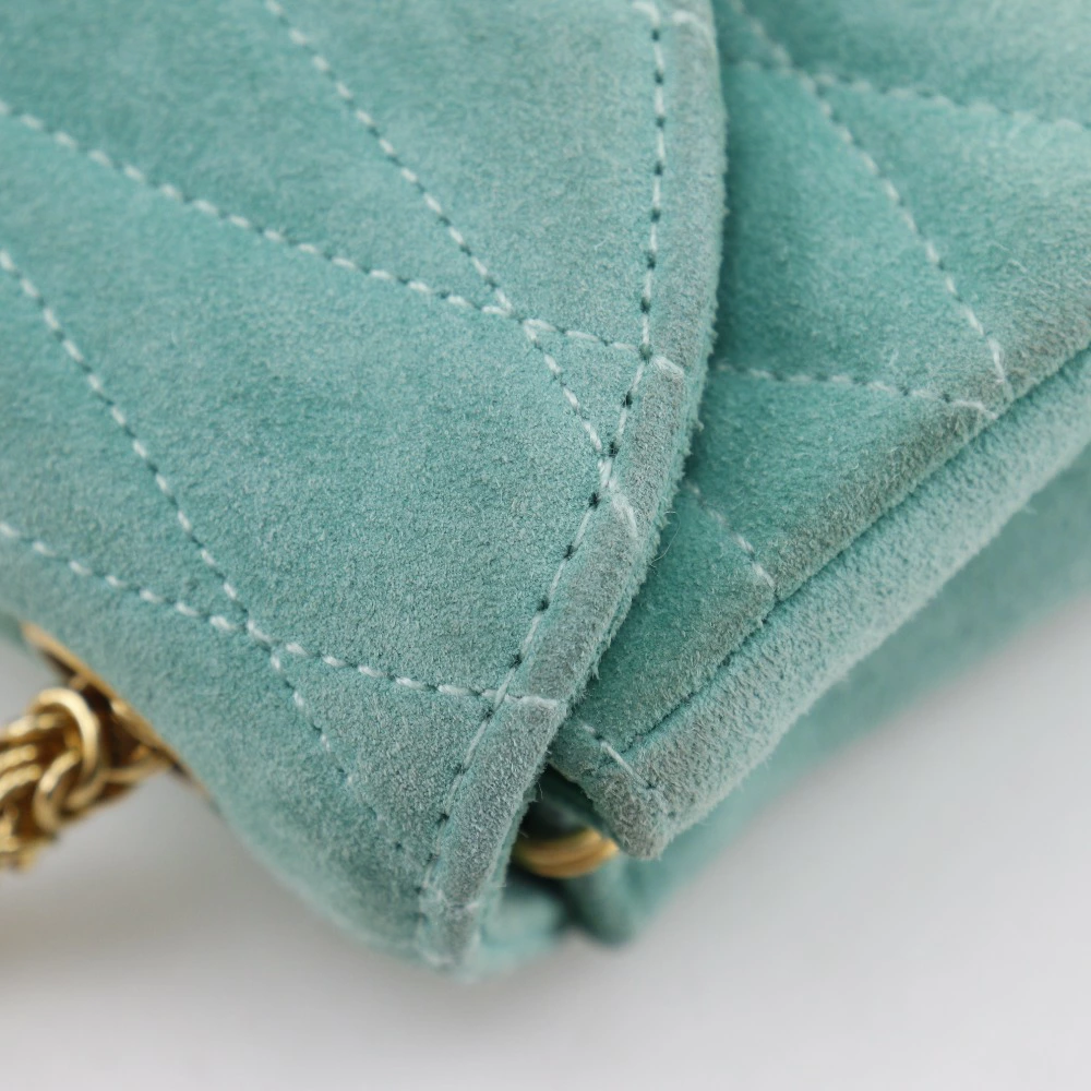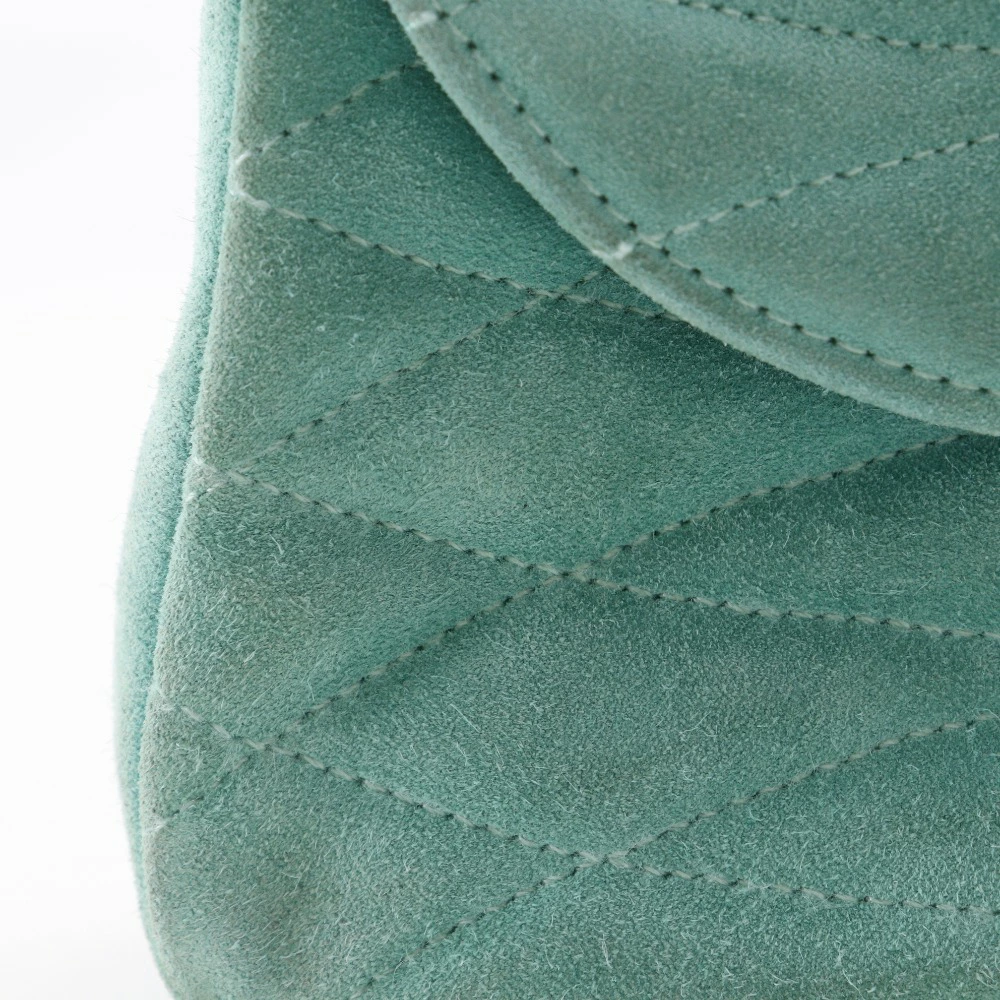 Pre-owned Chanel chain handbag featuring the Coco Mark, vintage suede, made in France, green, and a turnlock pattern. Condition: B-grade.