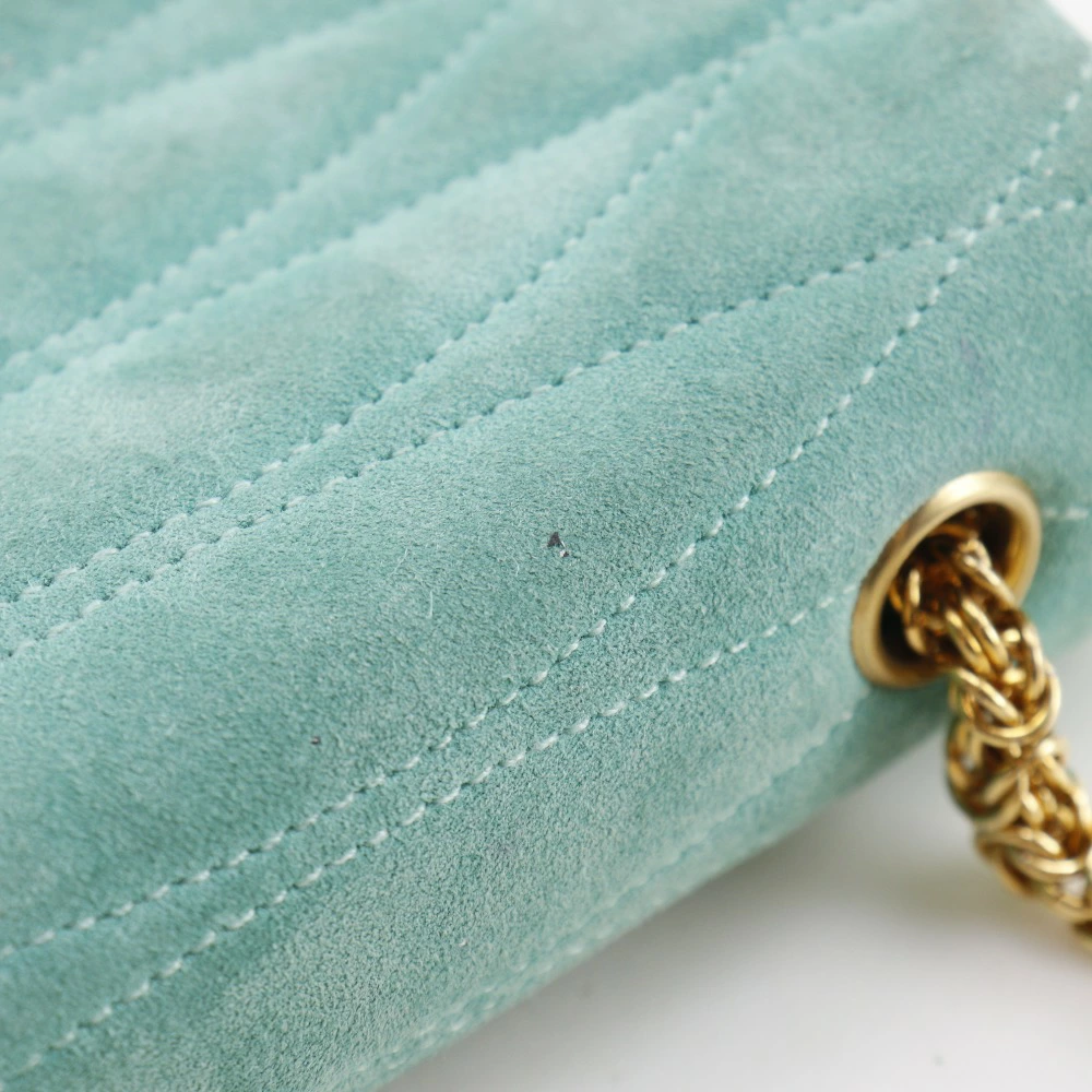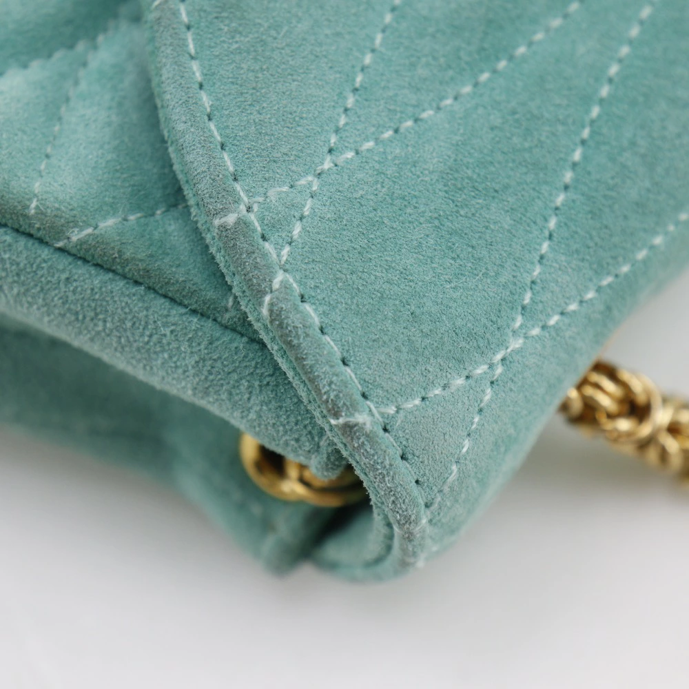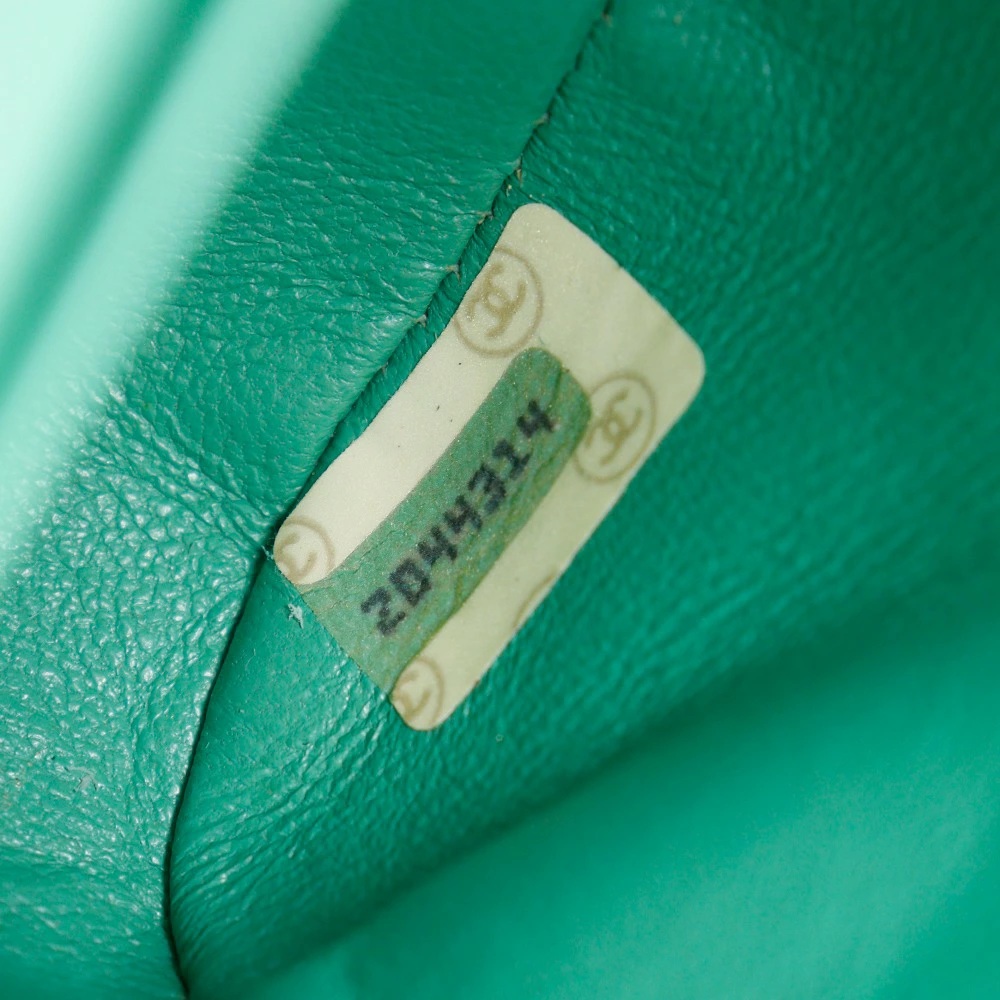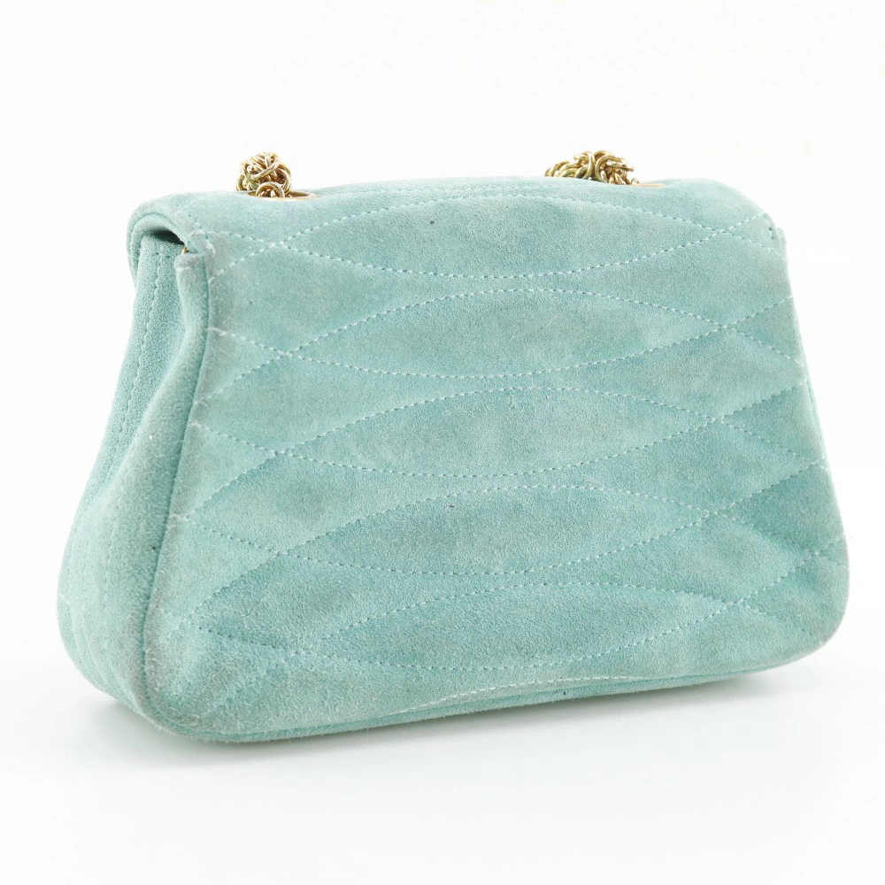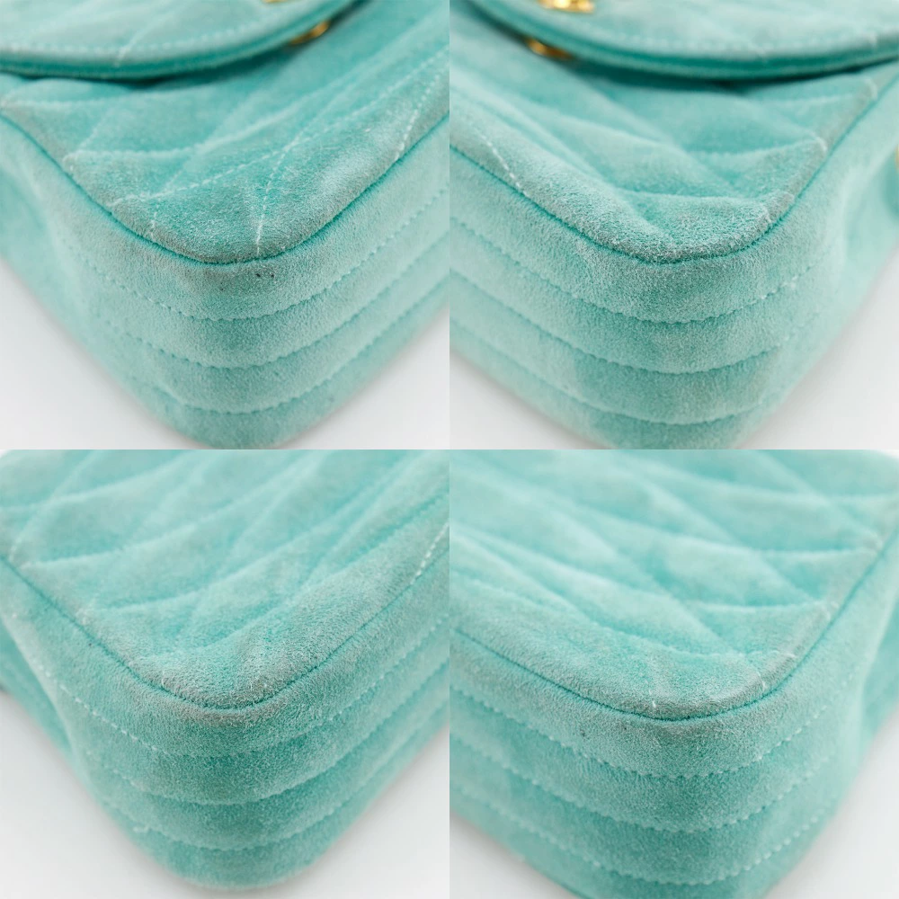 Pre-owned Chanel chain handbag featuring the Coco Mark, vintage suede, made in France, green, and a turnlock pattern. Condition: B-grade.