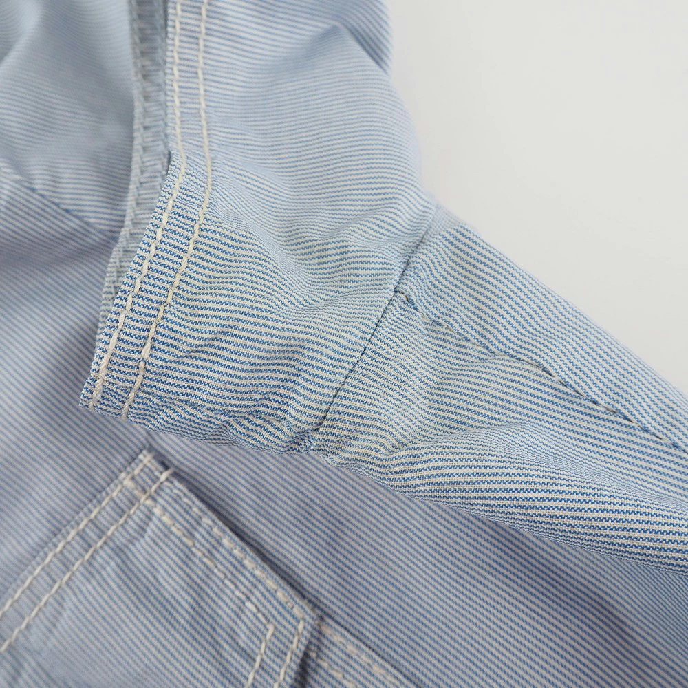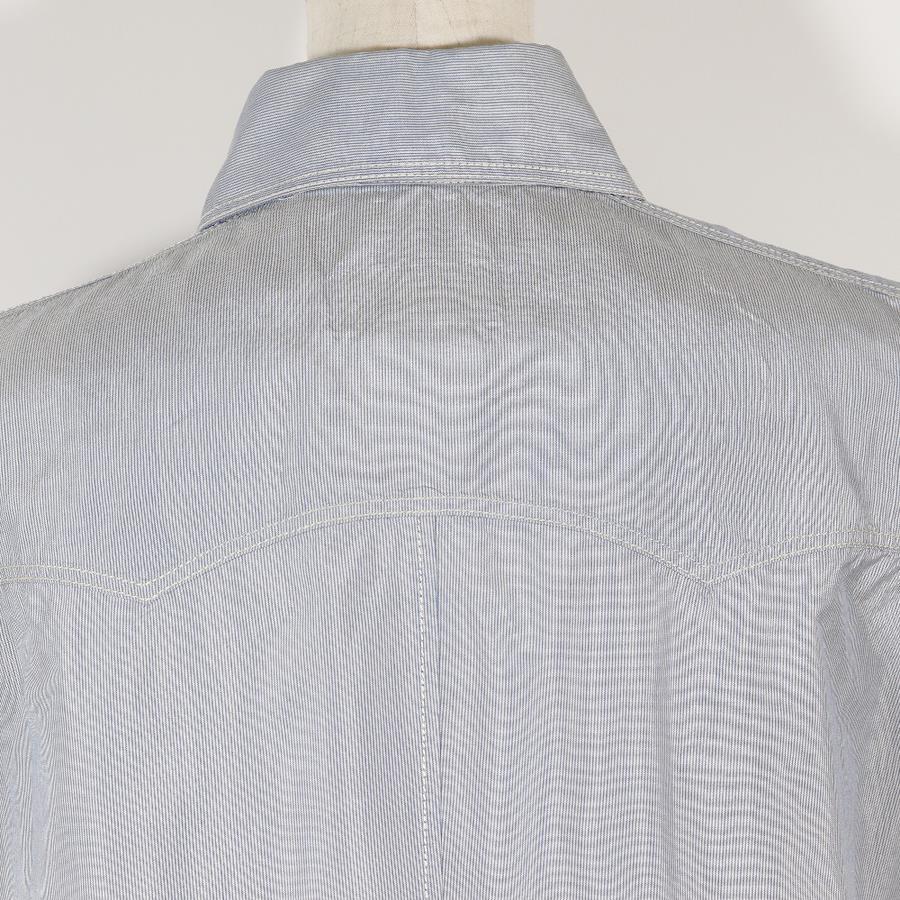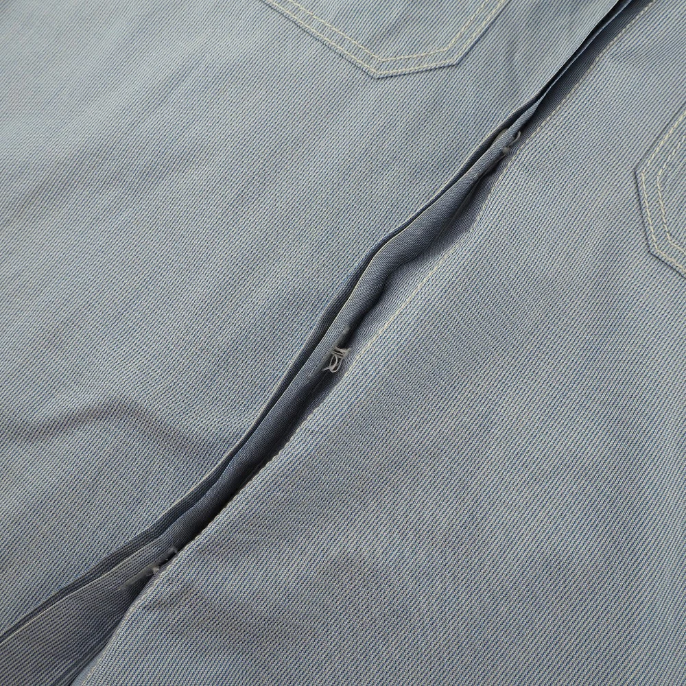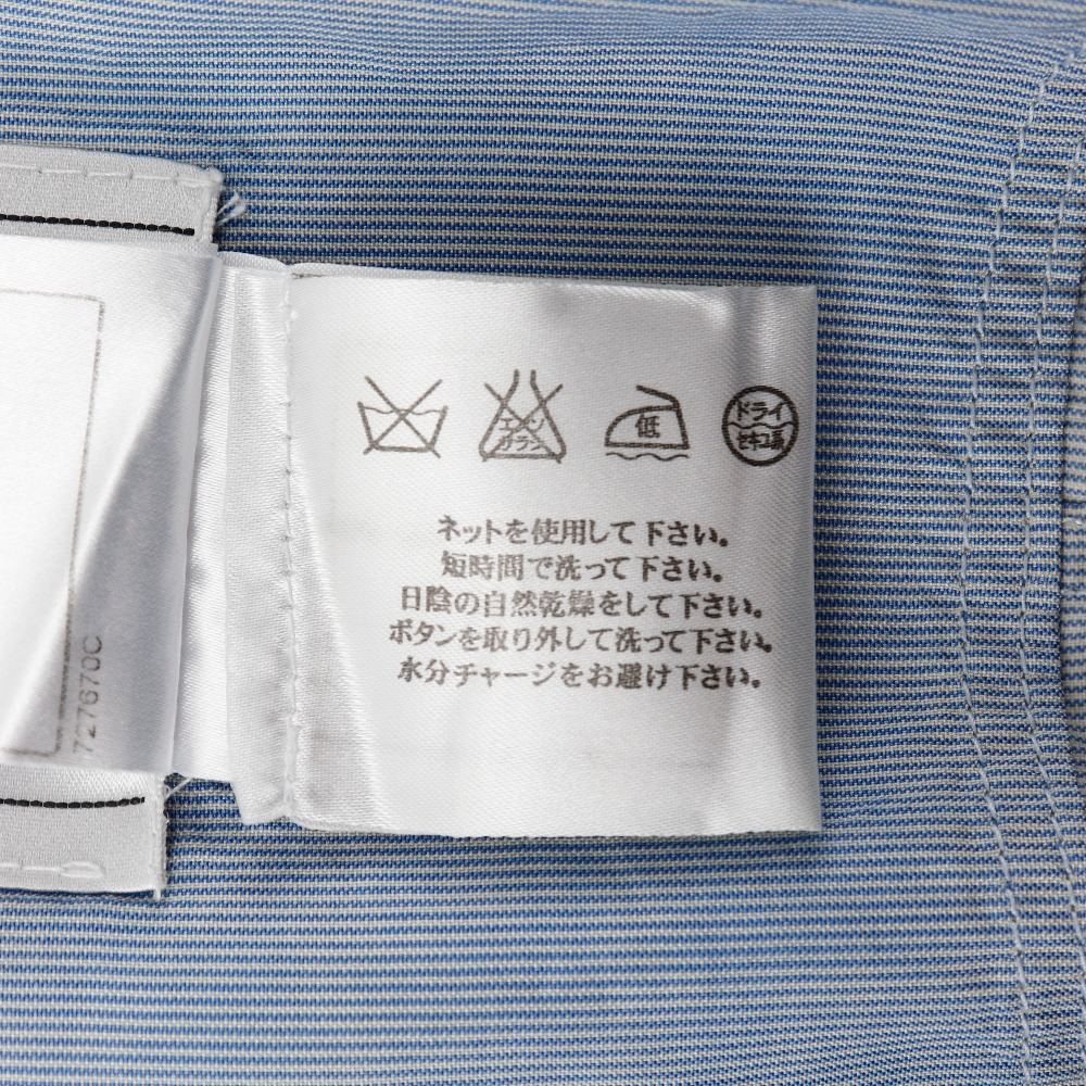 襟に黄ばみ、脇にシミがございます。ボタン部分に剥げ、ほつれがございます。