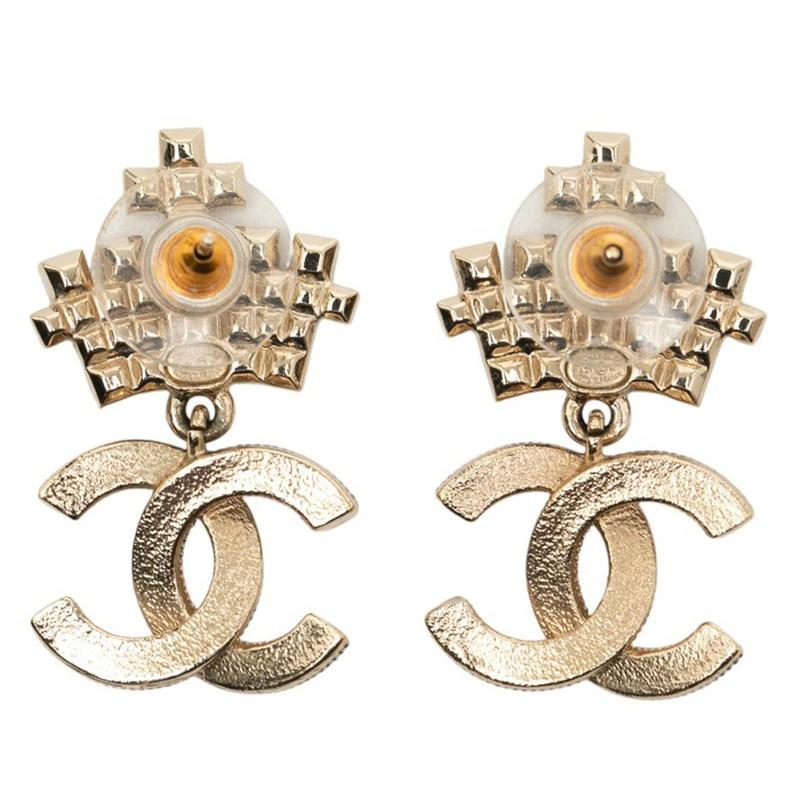 Pre-owned Chanel Coco Mark pearl and rhinestone crown earrings, gold plated, for women.