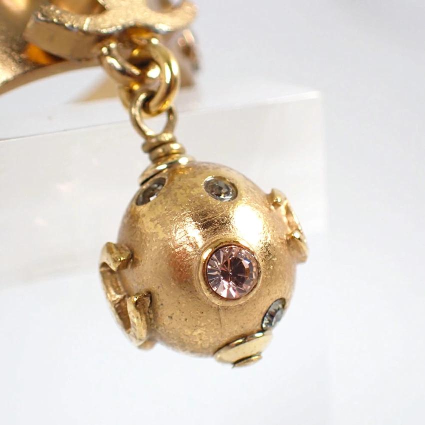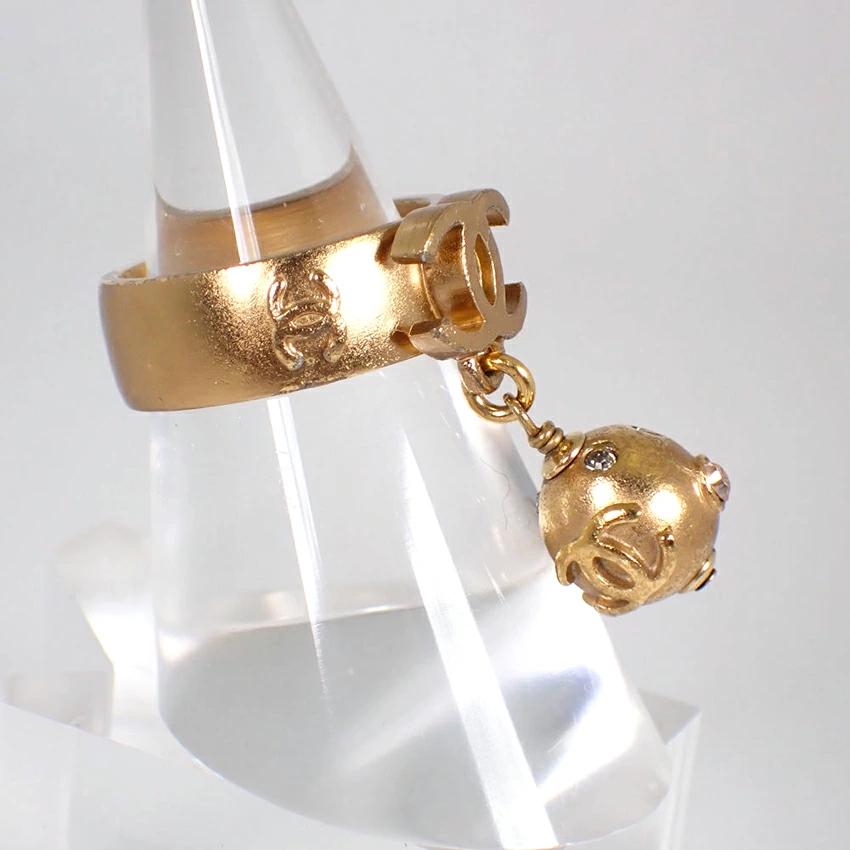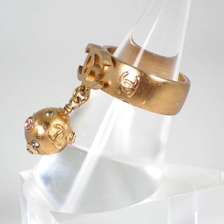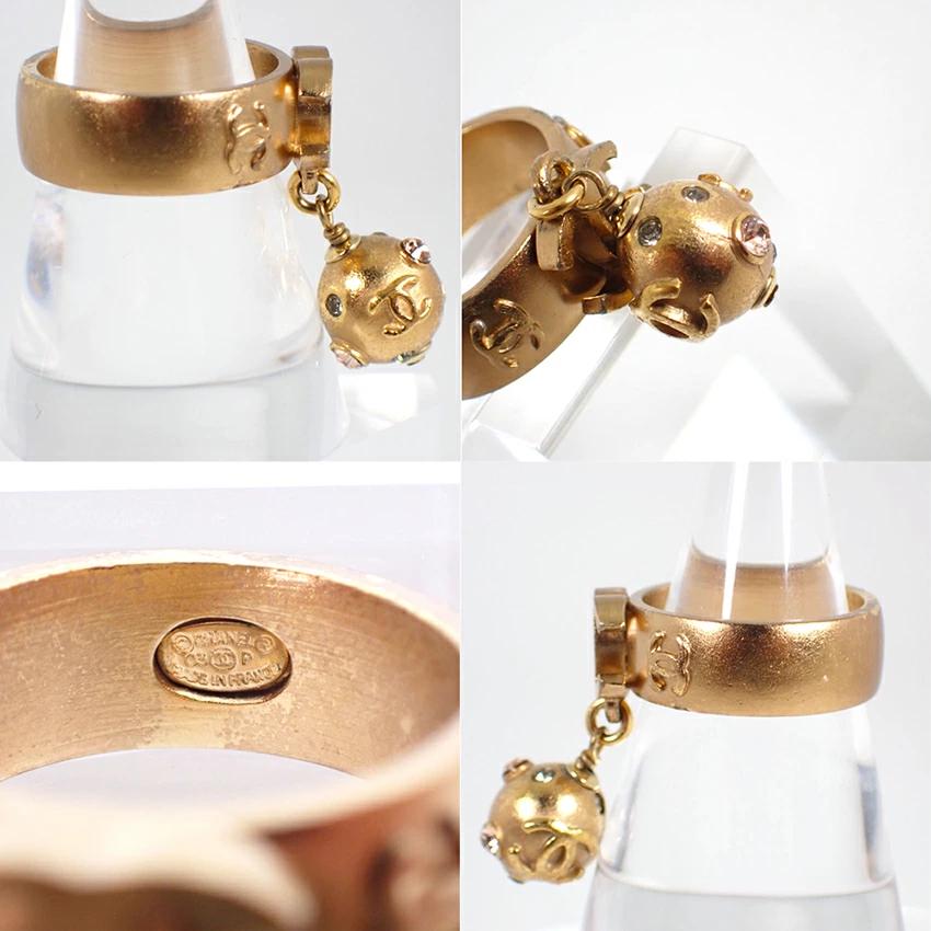 This beautiful CHANEL ring features a dangling ball design featuring a Coco mark studded with pale pink and colorless rhinestones. While there is some aging, there are no visible scratches or peeling, and the item is in very good overall condition.