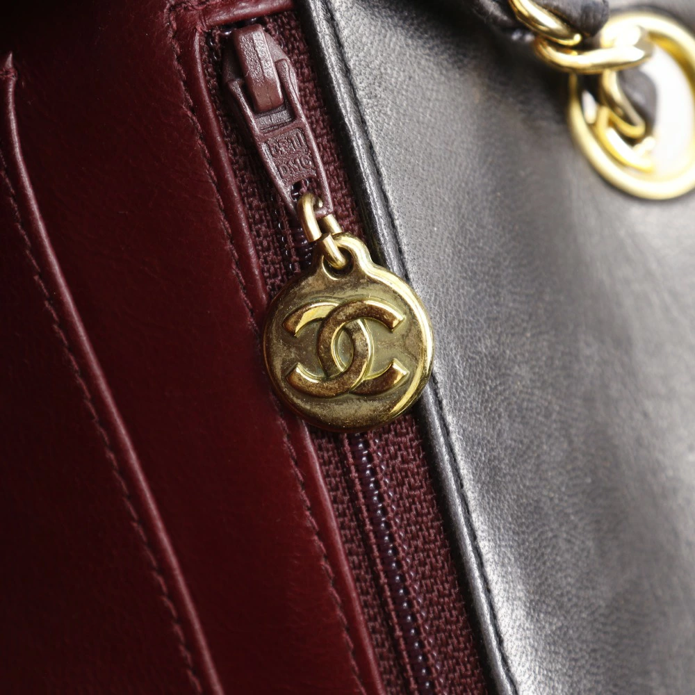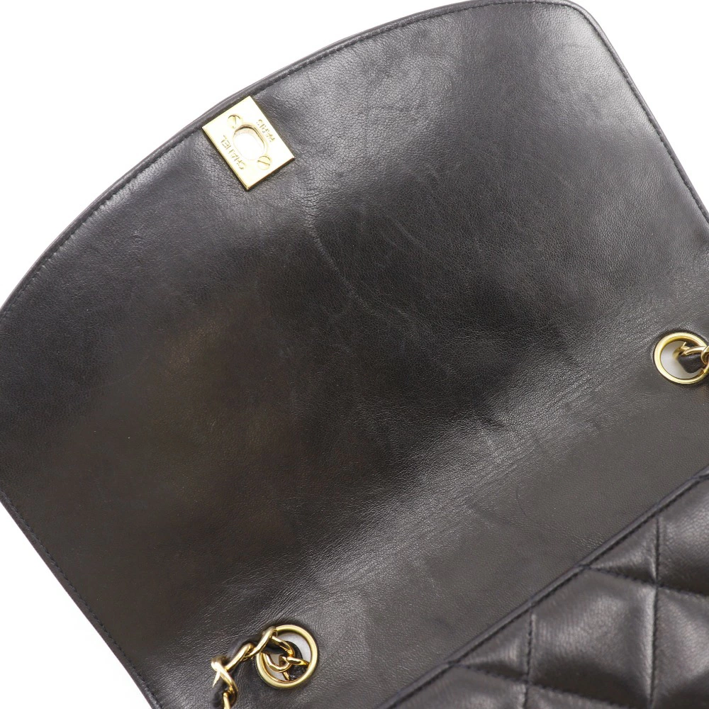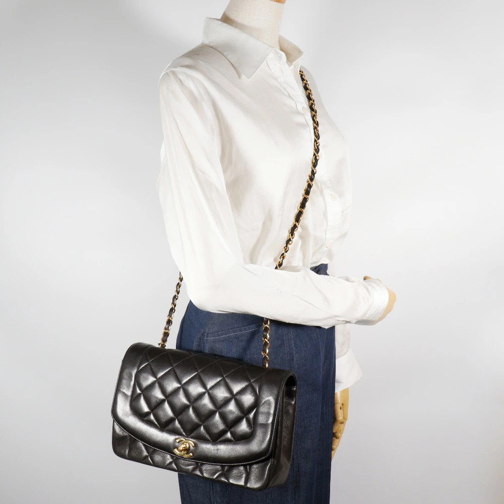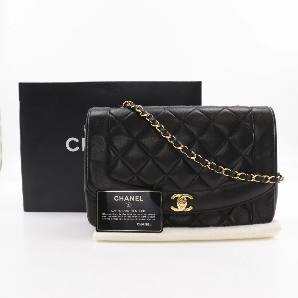 Pre-owned CHANEL Diana 25 Matelasse Chain Shoulder Bag (A01165) in Black Lambskin with A5 Turn Lock Strap. This vintage Diana 25 bag is perfect for women.