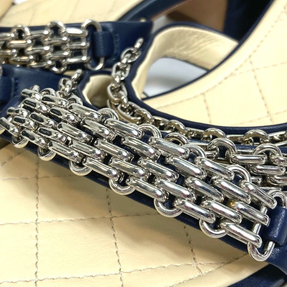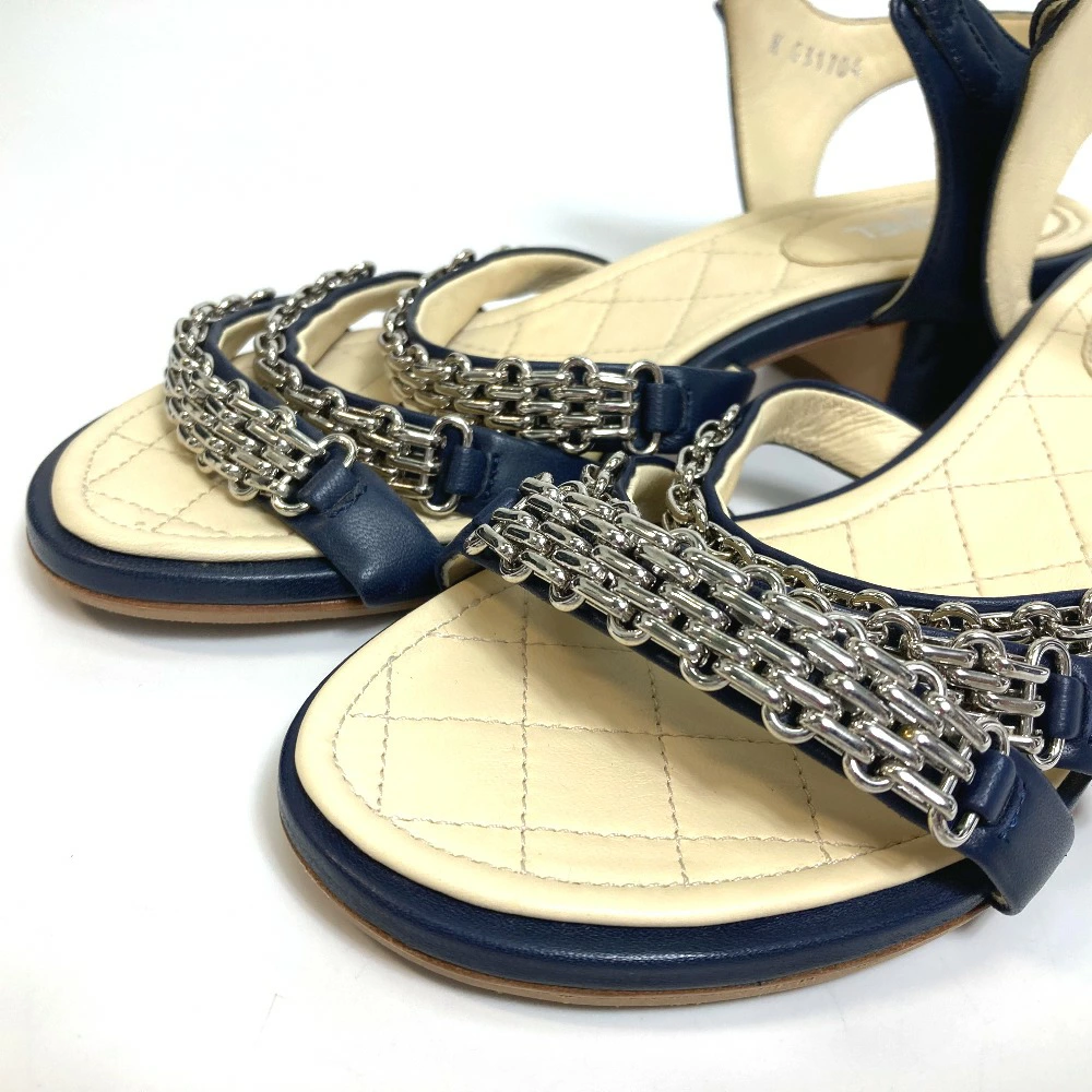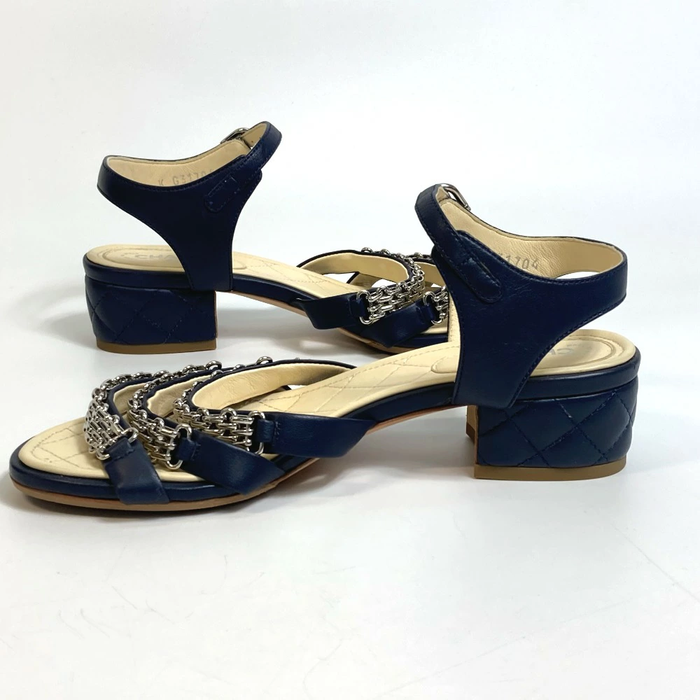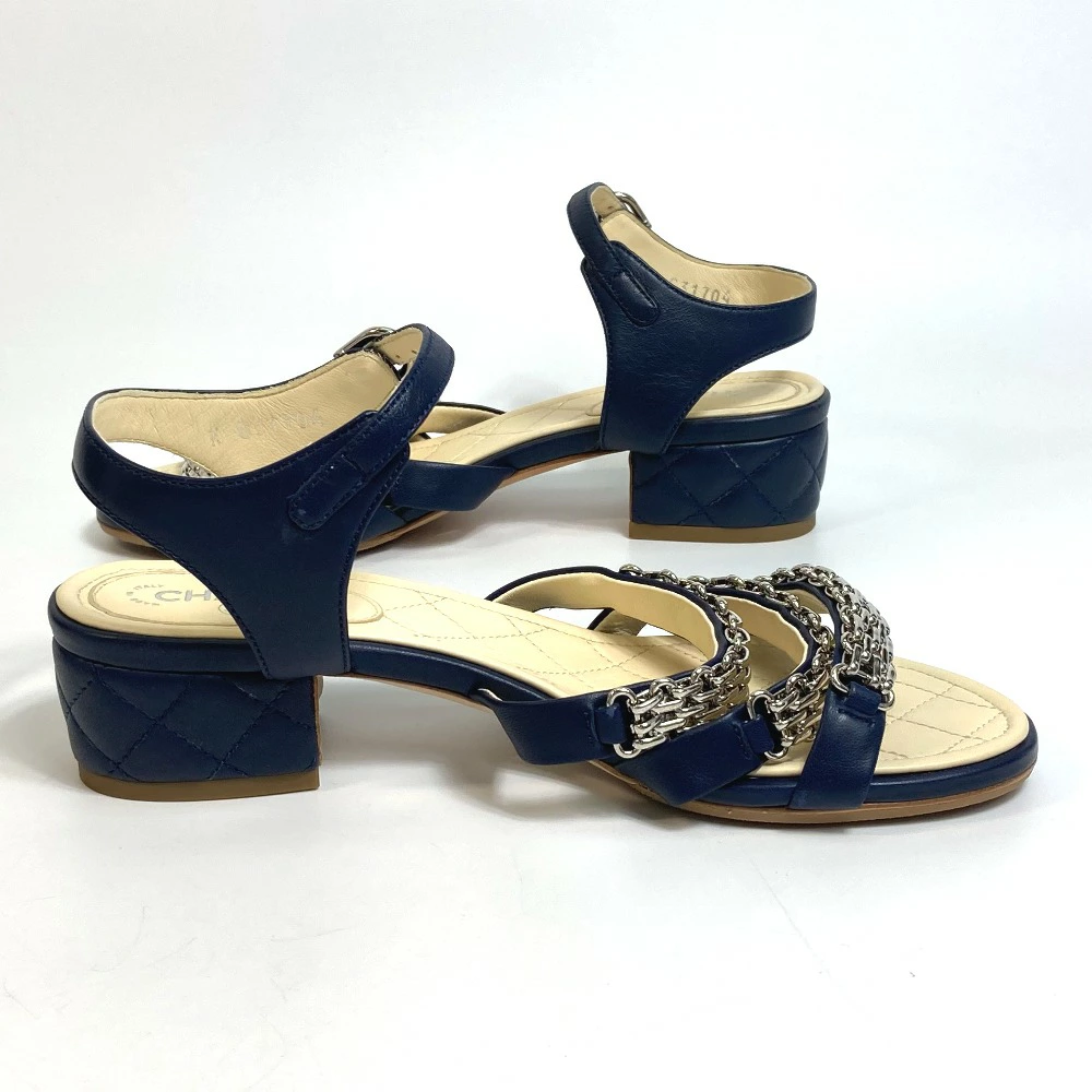 | 商品説明 | 綺麗なネイビーカラーにシルバー金具のチェーンを飾ったアンクルストラップのサンダルです。 |