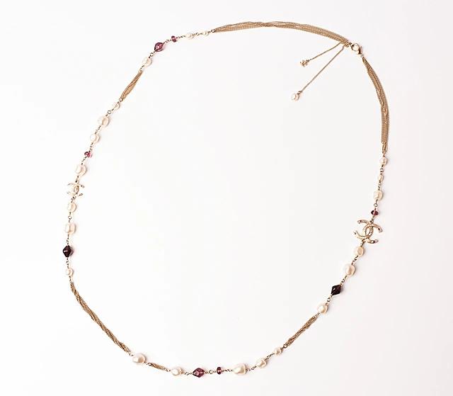 シャネルより、大小のCCマークとフェイクパールがモチーフのロングネックレスです。2重に重ねてもお使い頂けます。パールがふんだんに散りばめられたゴージャスなチェーンネックレスで、フォーマルから、ワンピース、パーティーシーンなどで、大活躍しそうです。