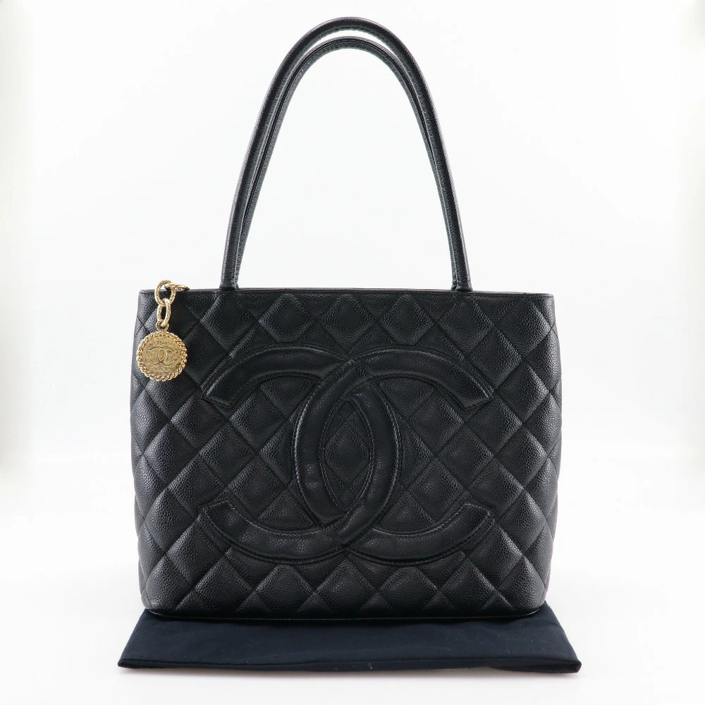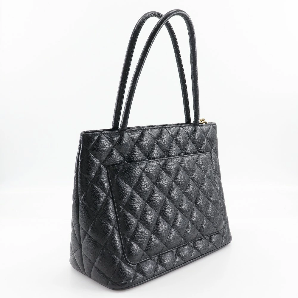 Pre-owned Chanel Medallion Tote Bag A01804, made in Italy from caviar leather, black, shoulder bag, A5 size, zippered, for women.