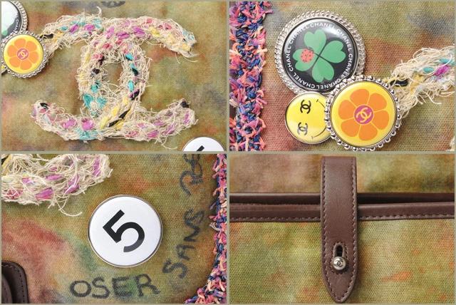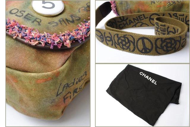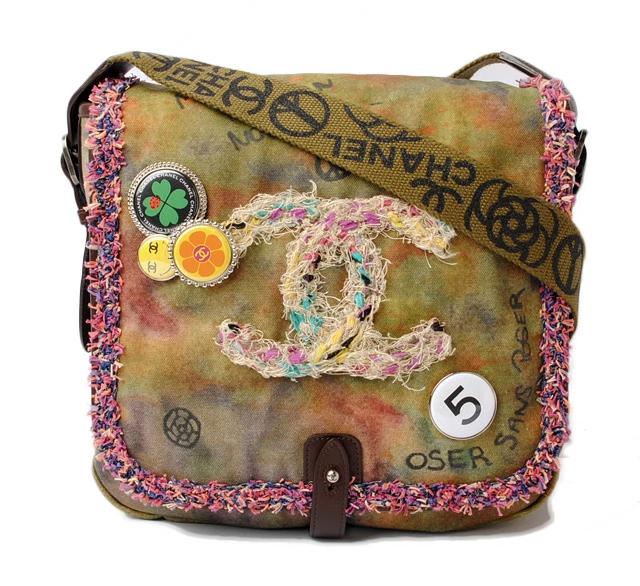 シャネルより、メッセンジャーバッグです。絵の具で描いたような色使いが美しいデザイン。落書きを思わせるグラフィカルなデザイン、パッチワーク風な刺繍、缶バッジなど、個性的な大変レアなデザインのバッグです。ショルダーストラップには、ラメを施したプリントでロゴは表現しております。内ポケットやフックコード付きで機能性も十分です。